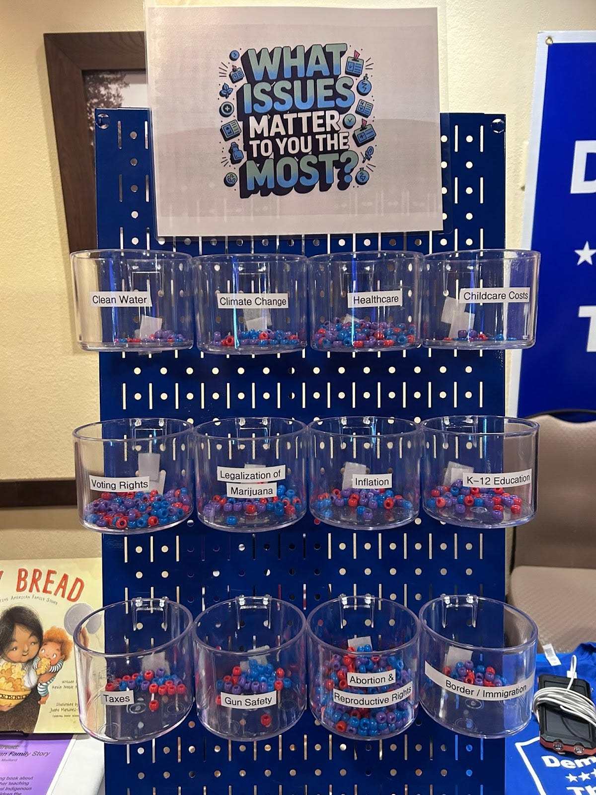 At a convention booth run by the Tri County Influence Campaign — an effort in Brown, Door and Kewaunee counties — they asked “What issues matter to you most?” with booth visitors encouraged to use beads to select three issues.