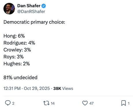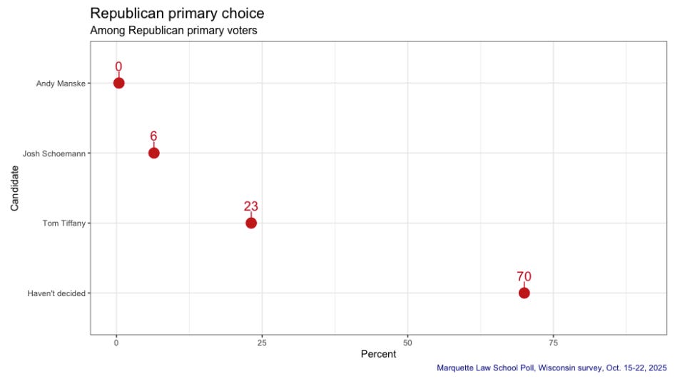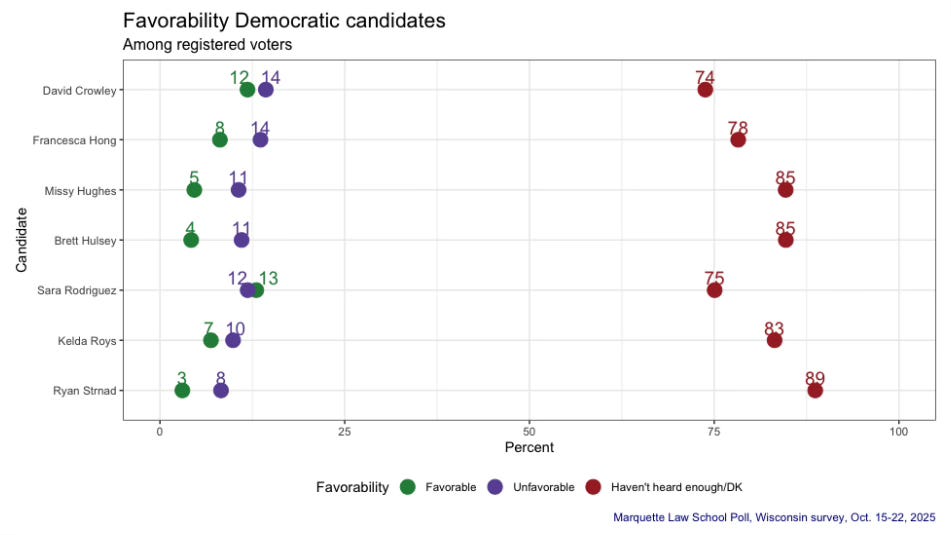 Among the highlights going into this poll, the first Wisconsin edition released since June, was that this would be the first poll of the still-emerging field for the 2026 governor’s race, the first open contest for the office since 2010. On the Democratic side, we’ve seen campaign launch announcement after campaign launch announcement in recent weeks and months, so this was going to be the first big test of how the field was taking shape.