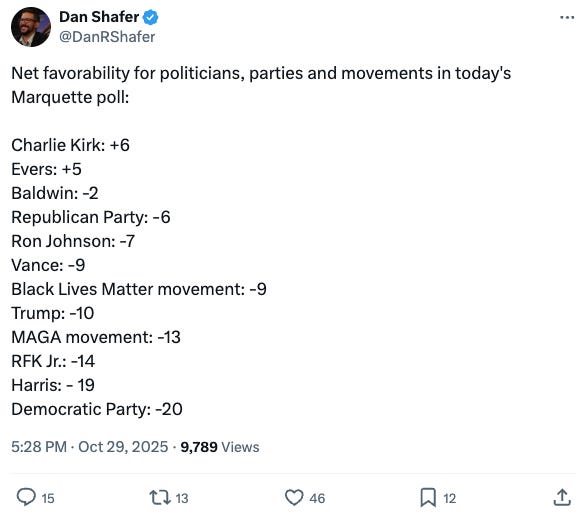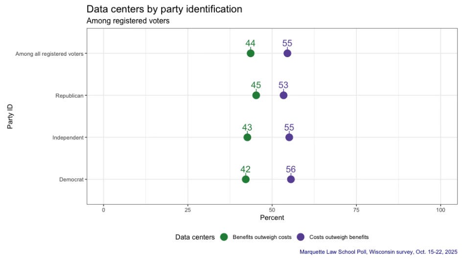 I asked Charles Franklin about this after the poll, and he said, “This is a new issue. It’s not like we’ve had a huge debate for years about data centers, the way we have about the Affordable Care Act. So the partisan lines are not clearly drawn at this point. I think if we see partisan leadership, in particular, running campaigns and talking about these issues, you’d expect to see a greater party divide in the future. But it’s really striking that this is an example of an issue — maybe because it’s new, maybe because of the nature of the issues — that the party lines are simply not clear, and voters, therefore, don’t show any differences by partisanship on this new issue. Check back in a year or two years and see if that party divide has developed.”