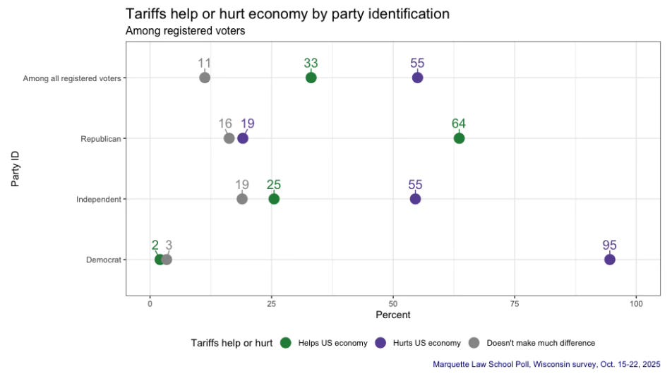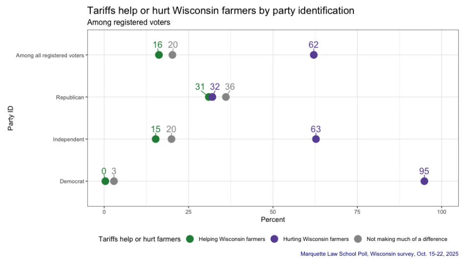 It’s not just typically liberal areas of the state, either, in the north and west part of the state, only 12% say tariffs are helping, with 66% saying these policies are hurting Wisconsin farmers. Only 19% in the Green Bay media market say tariffs are helping farmers, same as in the heavily anti-Trump Madison market. People can see what’s happening in front of them.