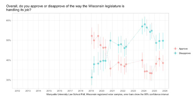 Disapproval of the legislature is not just a Milwaukee/Madison issue, either. The weakest approval numbers by region are found in the Green Bay media market, with only 31% there approving of the job the legislature is doing.