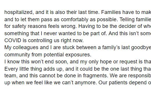 “I saw some people were saying that after the election this virus was just going to miraculously go away. If you could see what I see, the virus is still here and it’s not going away. It’s real. We’re never going to get over this if people don’t take it seriously.”