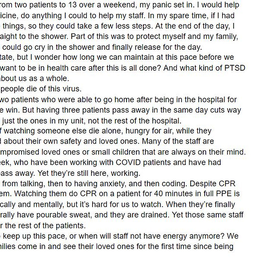"Who will want to be in health care after this is all done? What kind of PTSD will we all suffer?"