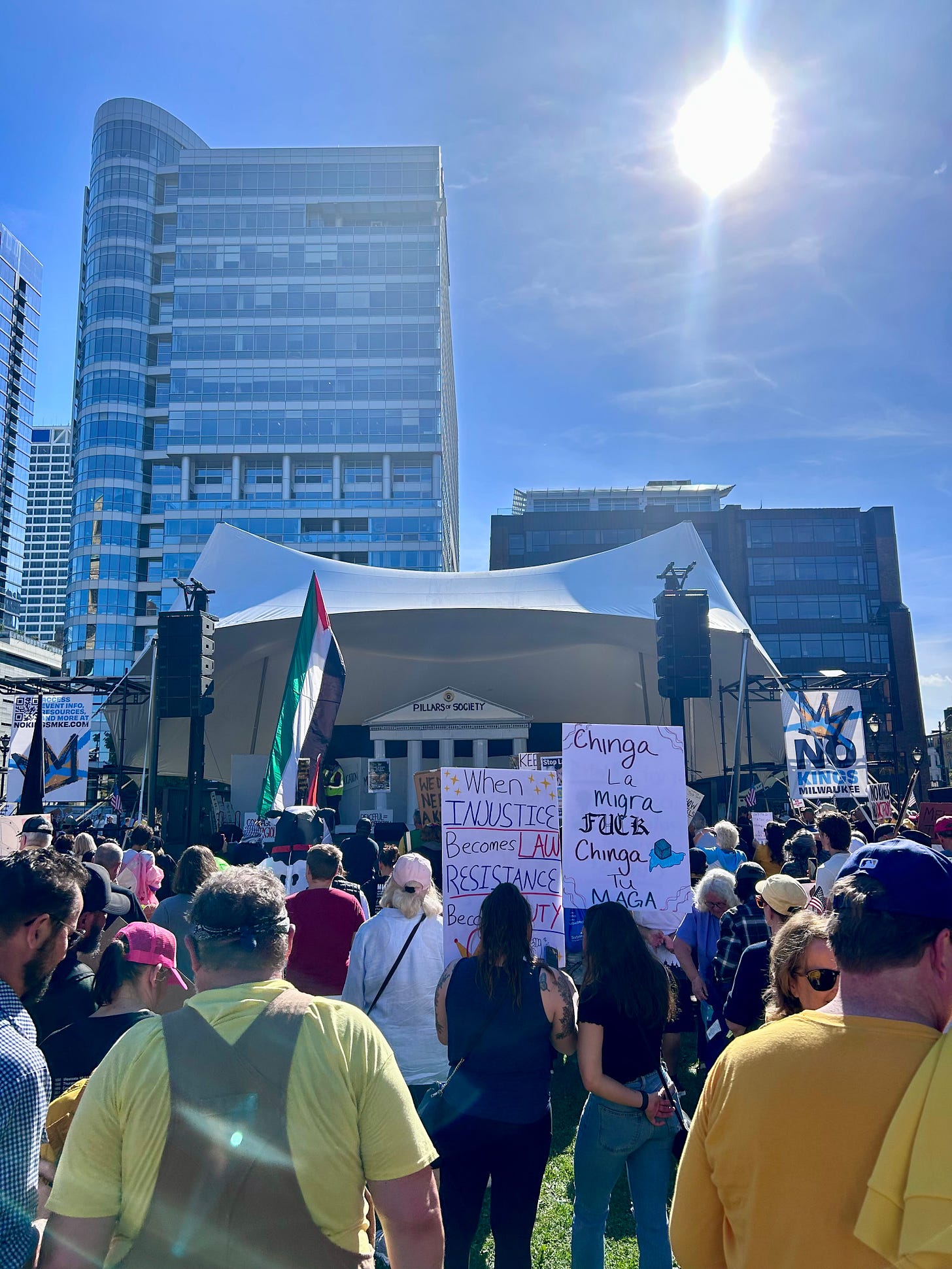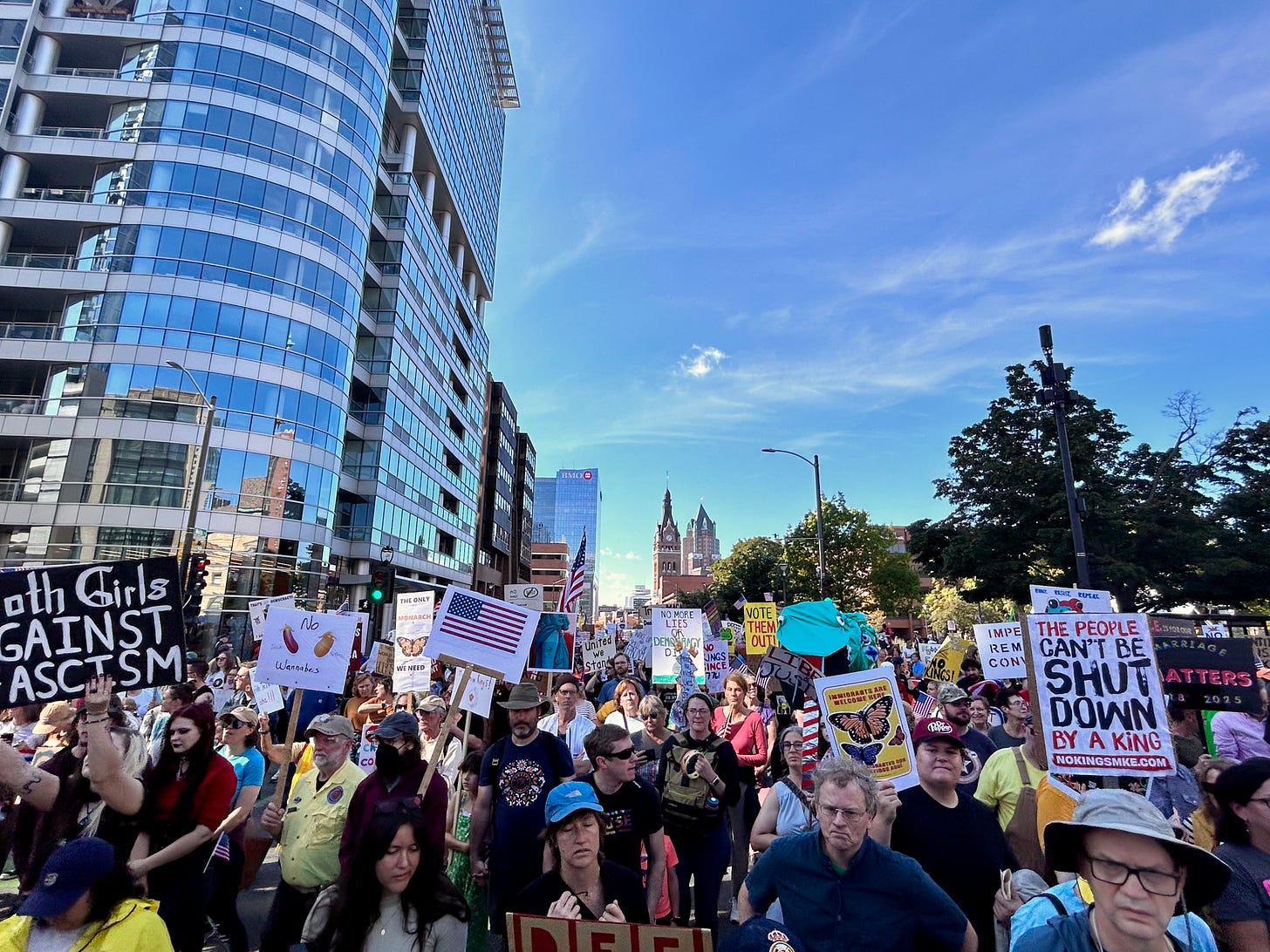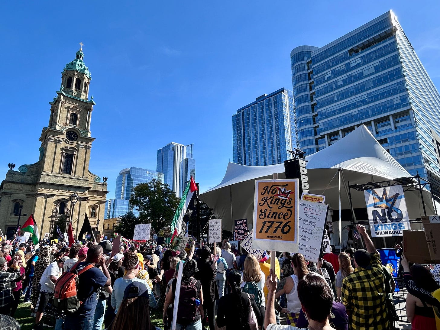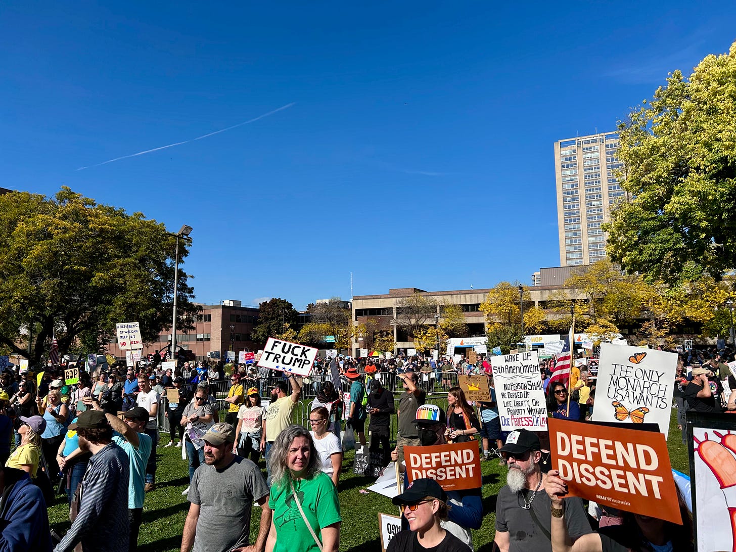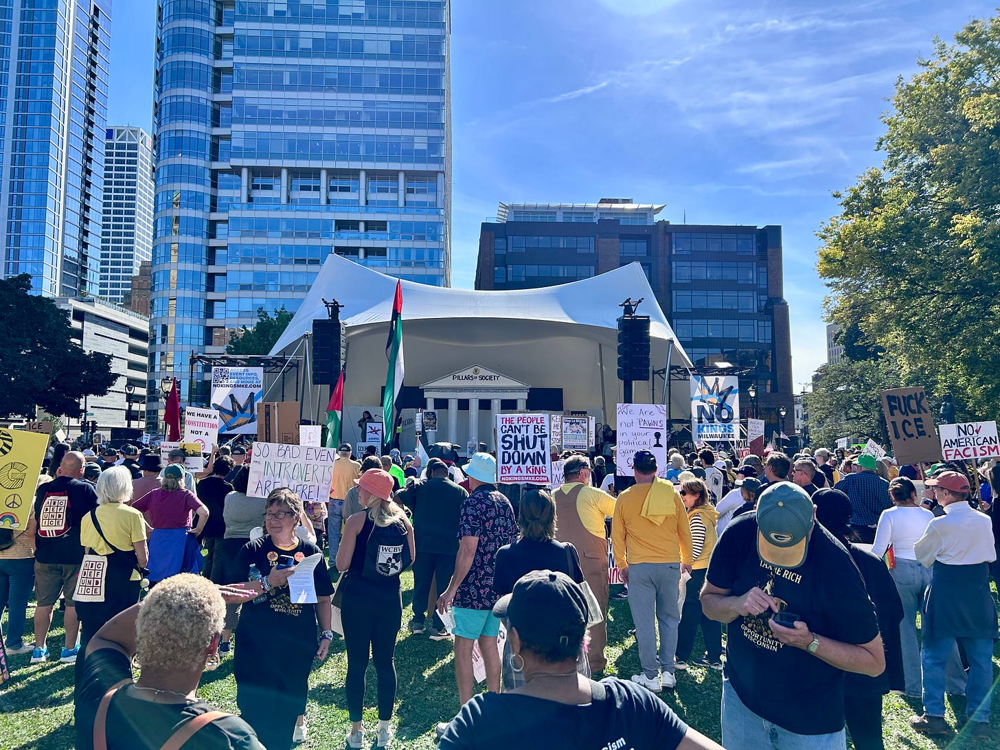 Thousands gathered peacefully at Cathedral Square Park, where a series of speakers (including Recombobulation Area contributor Angela Lang!) spoke at the park. Earl Ingram, host of the “What’s Going On with Earl Ingram” podcast on Civic Media, emceed and spoke at the event. Maggie Daun, host of “The Maggie Daun Show” on Civic Media, also spoke at the protest. You can watch the livestream from that here on the No Kings Milwaukee YouTube Channel.