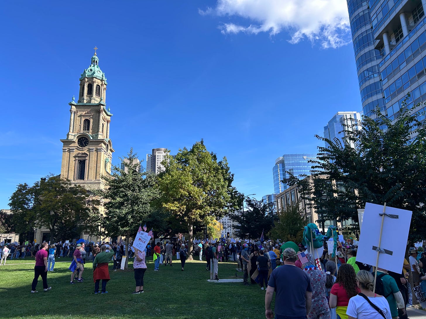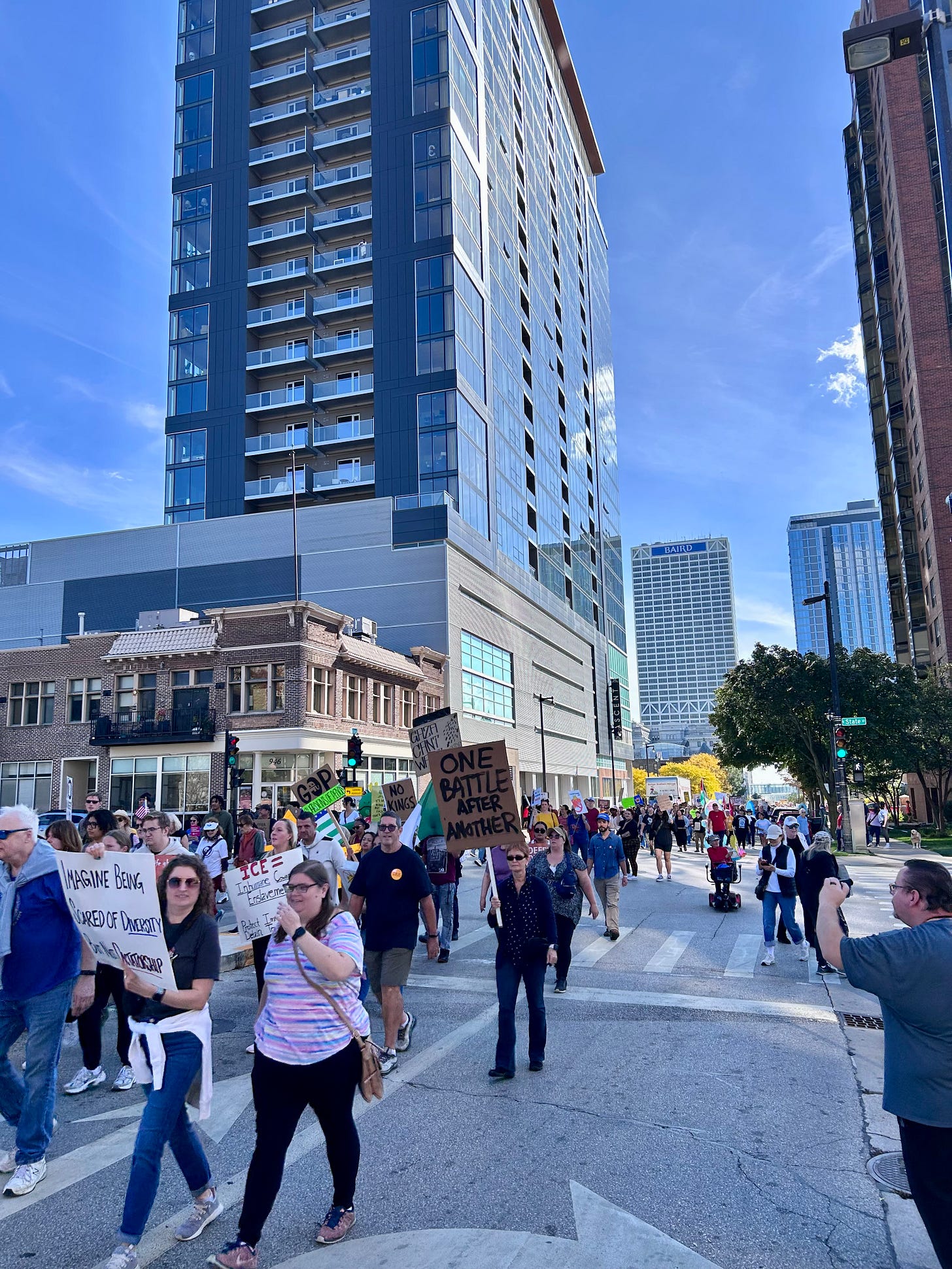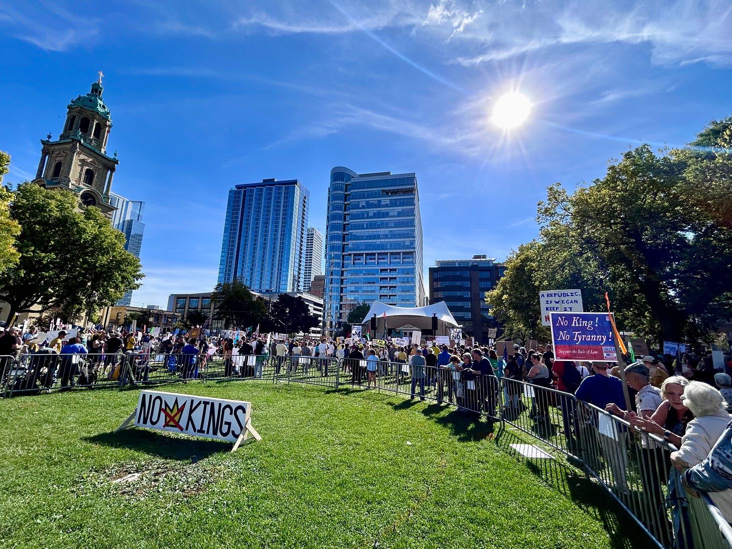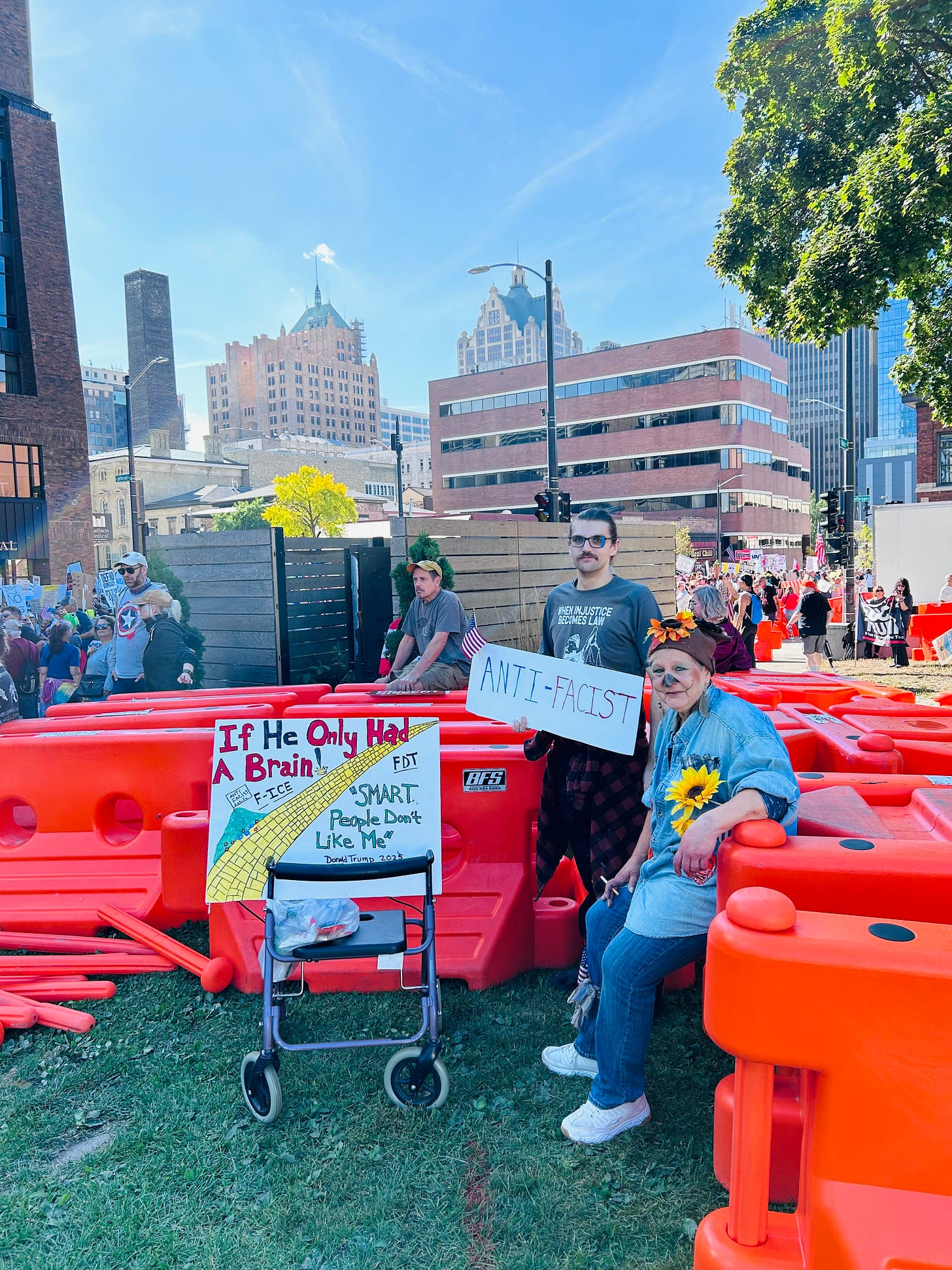 Thousands gathered peacefully at Cathedral Square Park, where a series of speakers (including Recombobulation Area contributor Angela Lang!) spoke at the park. Earl Ingram, host of the “What’s Going On with Earl Ingram” podcast on Civic Media, emceed and spoke at the event. Maggie Daun, host of “The Maggie Daun Show” on Civic Media, also spoke at the protest. You can watch the livestream from that here on the No Kings Milwaukee YouTube Channel.