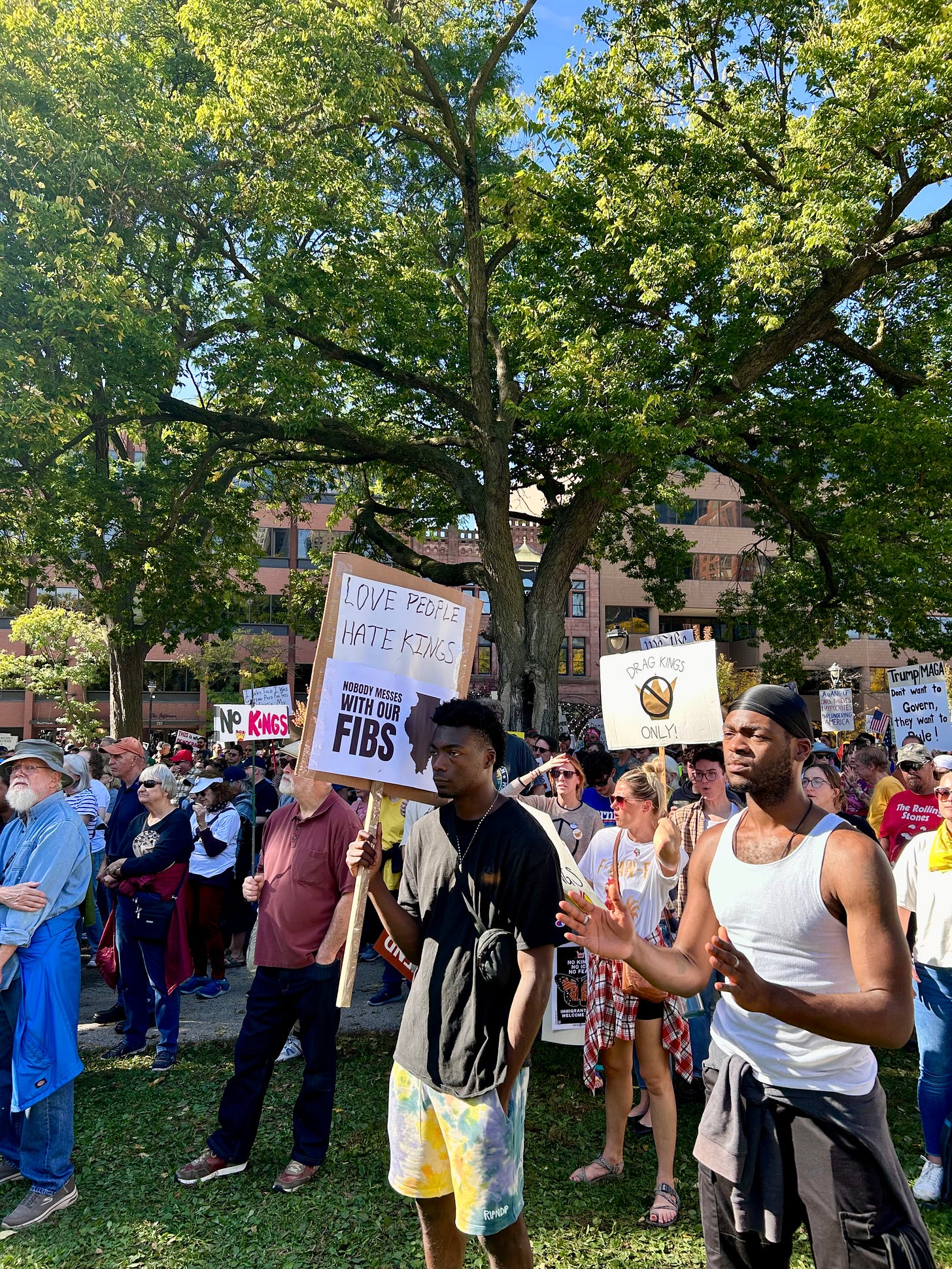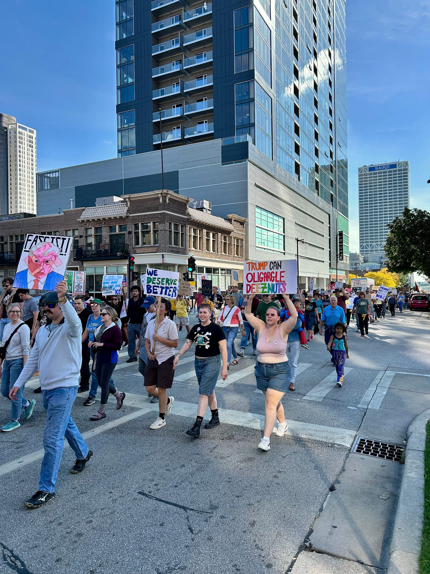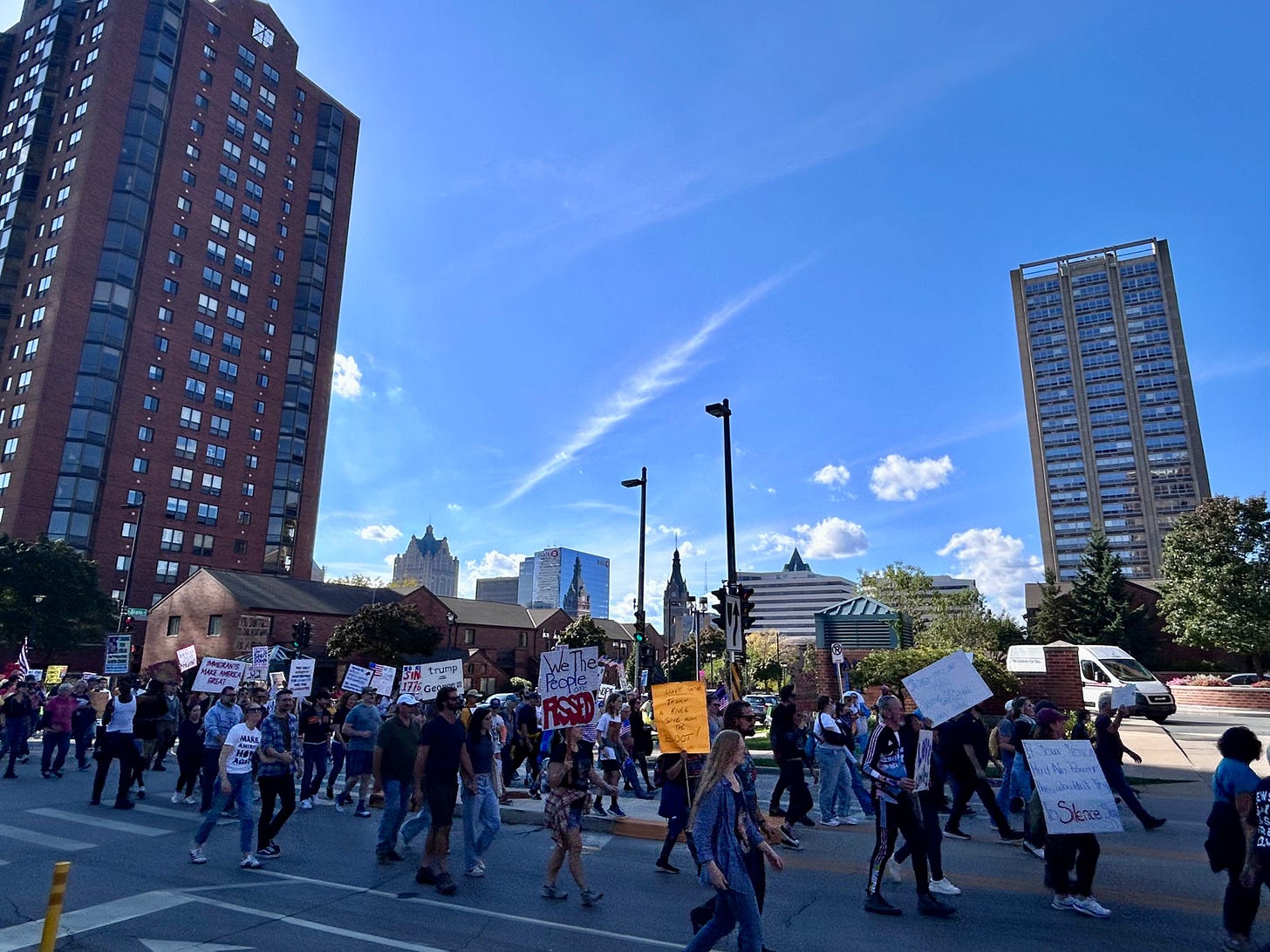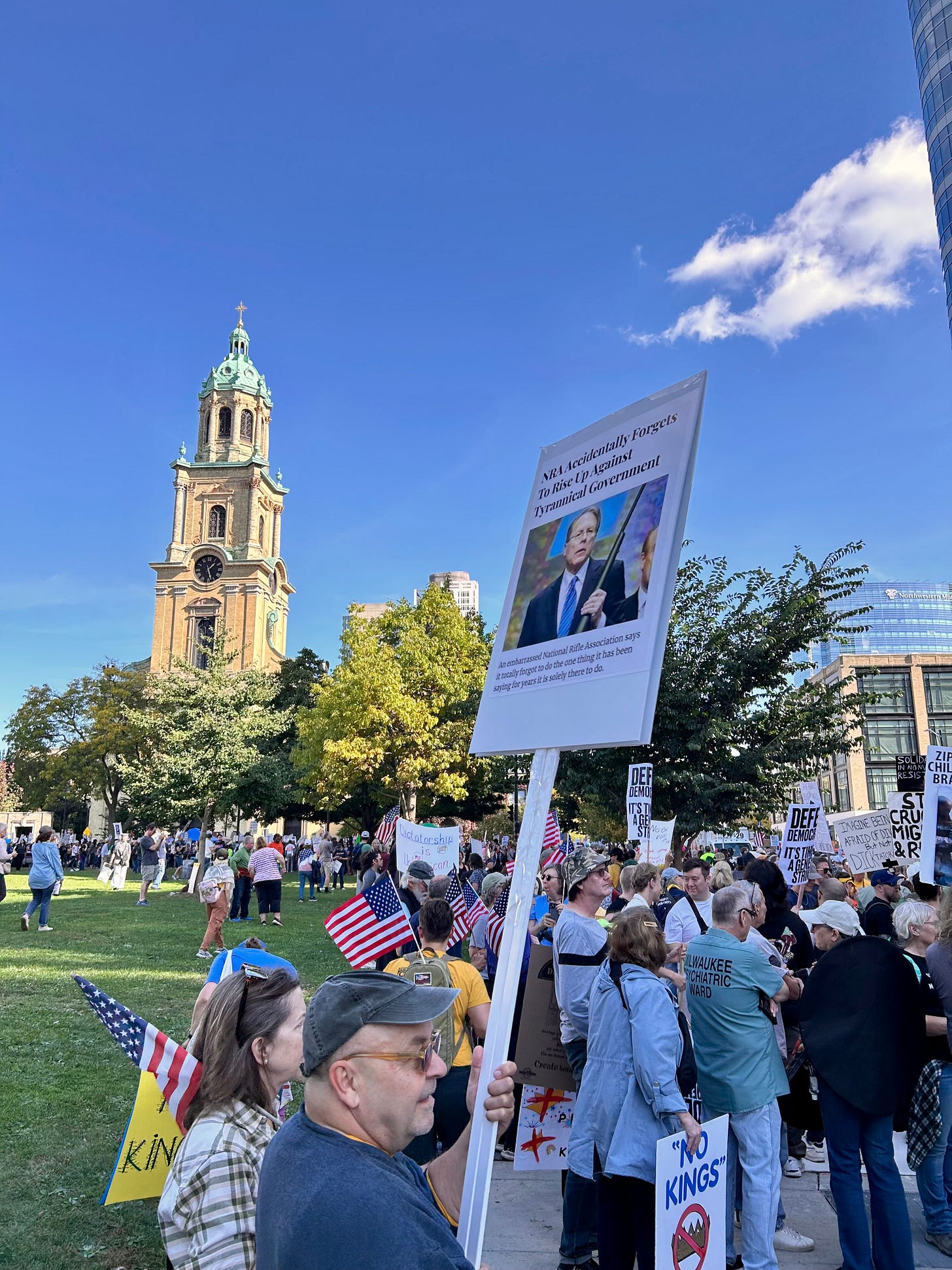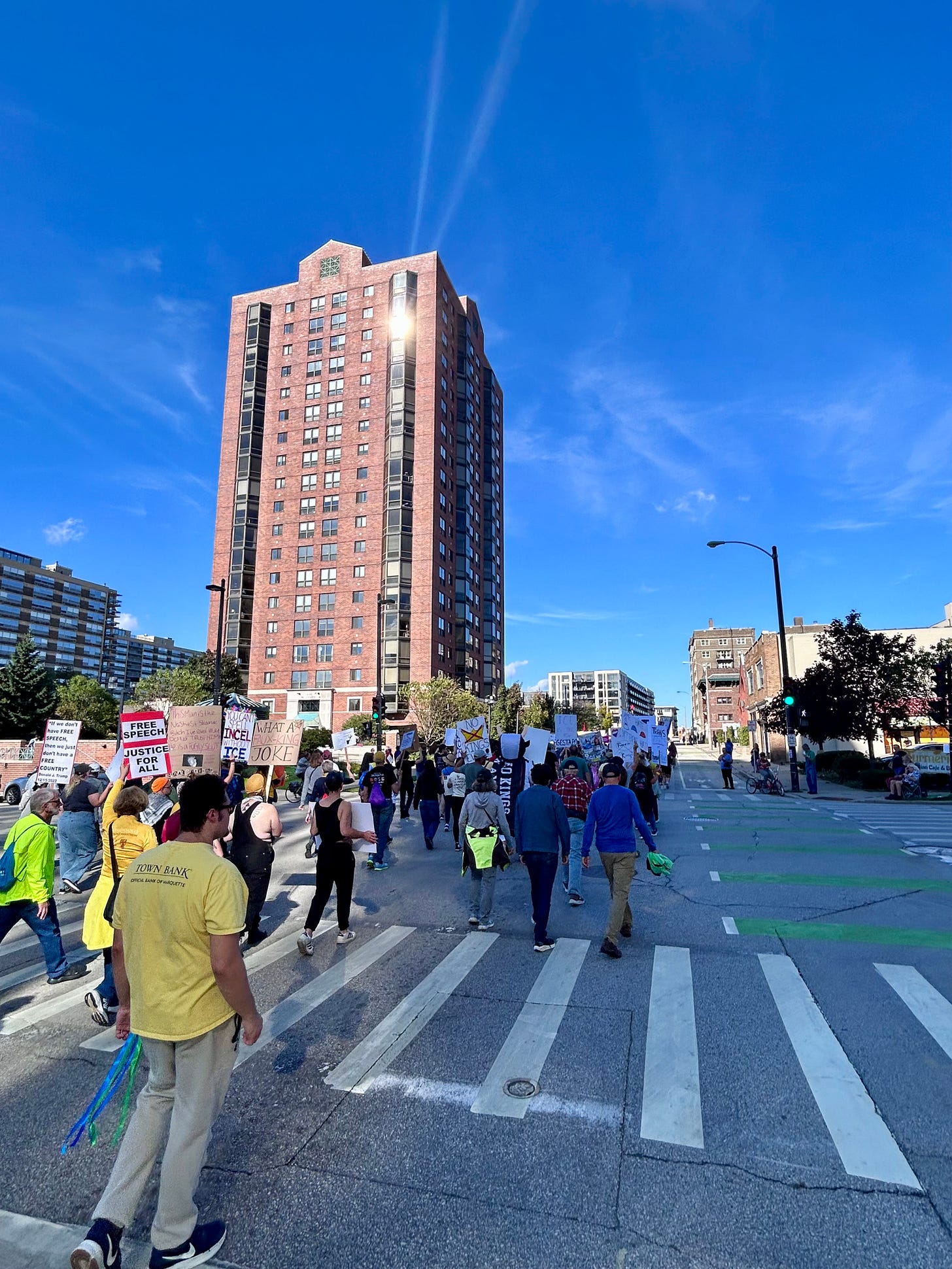 Thousands gathered peacefully at Cathedral Square Park, where a series of speakers (including Recombobulation Area contributor Angela Lang!) spoke at the park. Earl Ingram, host of the “What’s Going On with Earl Ingram” podcast on Civic Media, emceed and spoke at the event. Maggie Daun, host of “The Maggie Daun Show” on Civic Media, also spoke at the protest. You can watch the livestream from that here on the No Kings Milwaukee YouTube Channel.