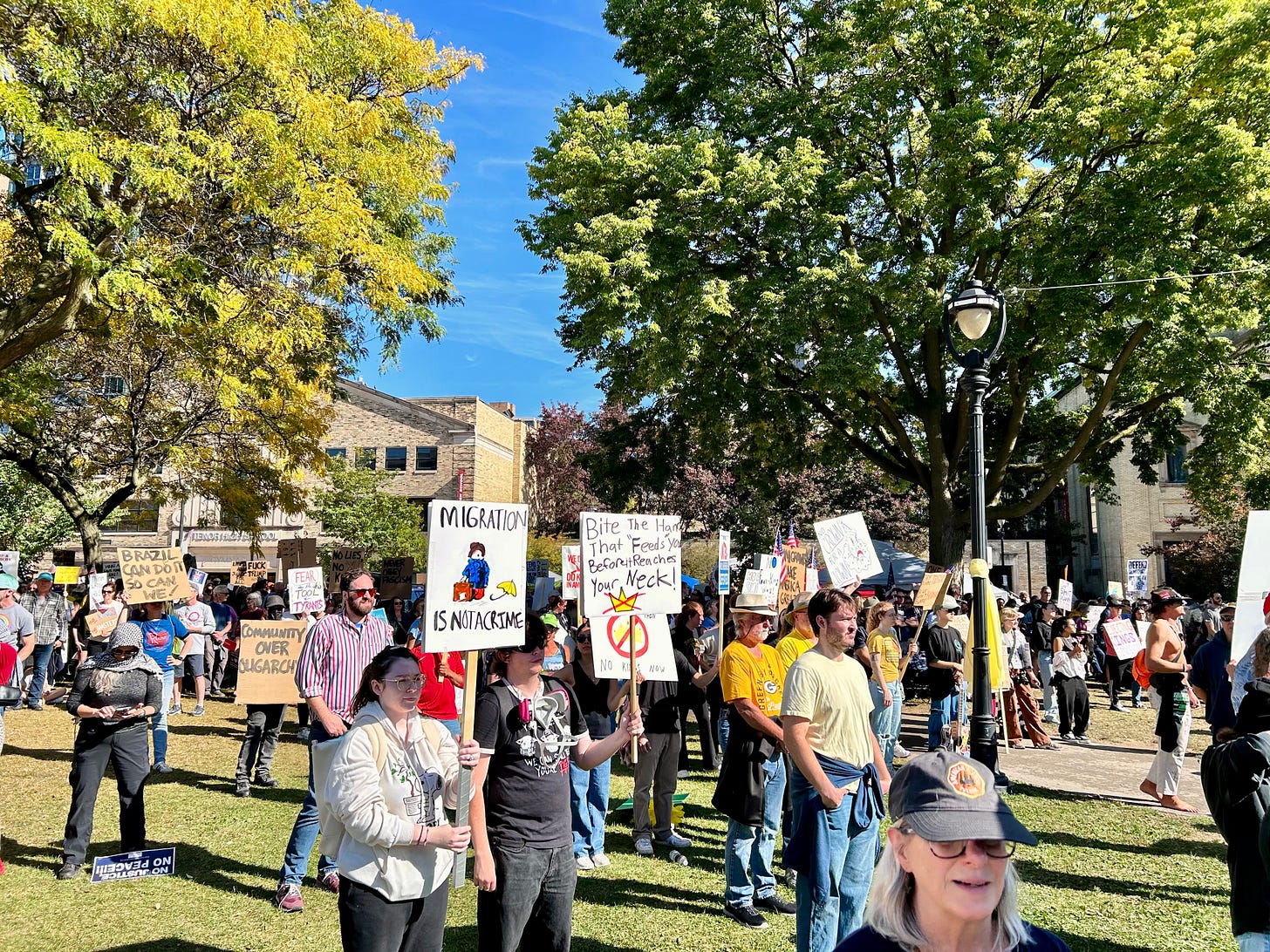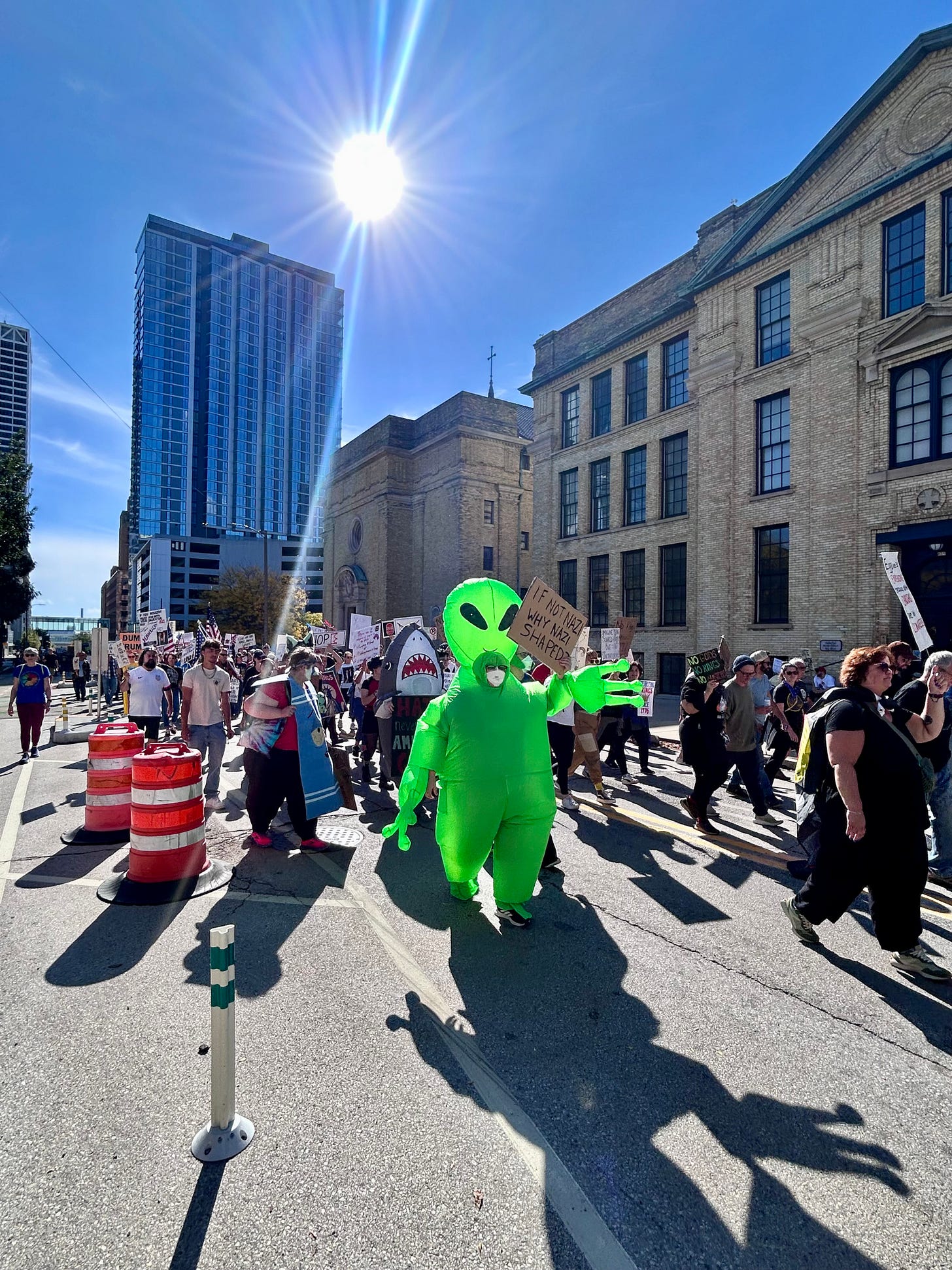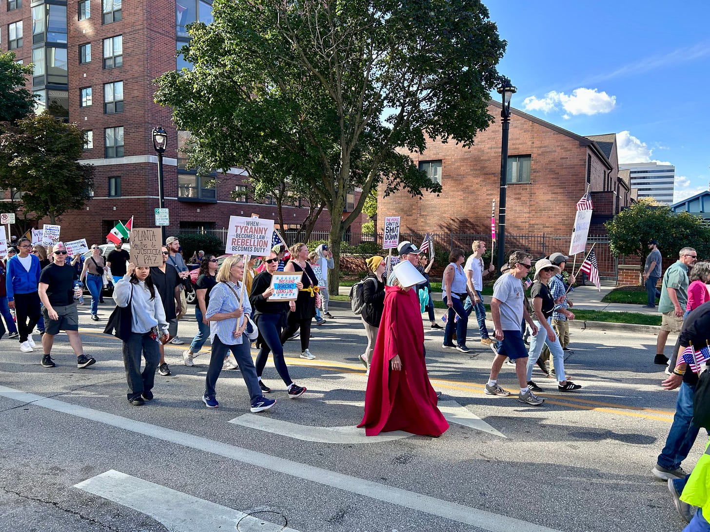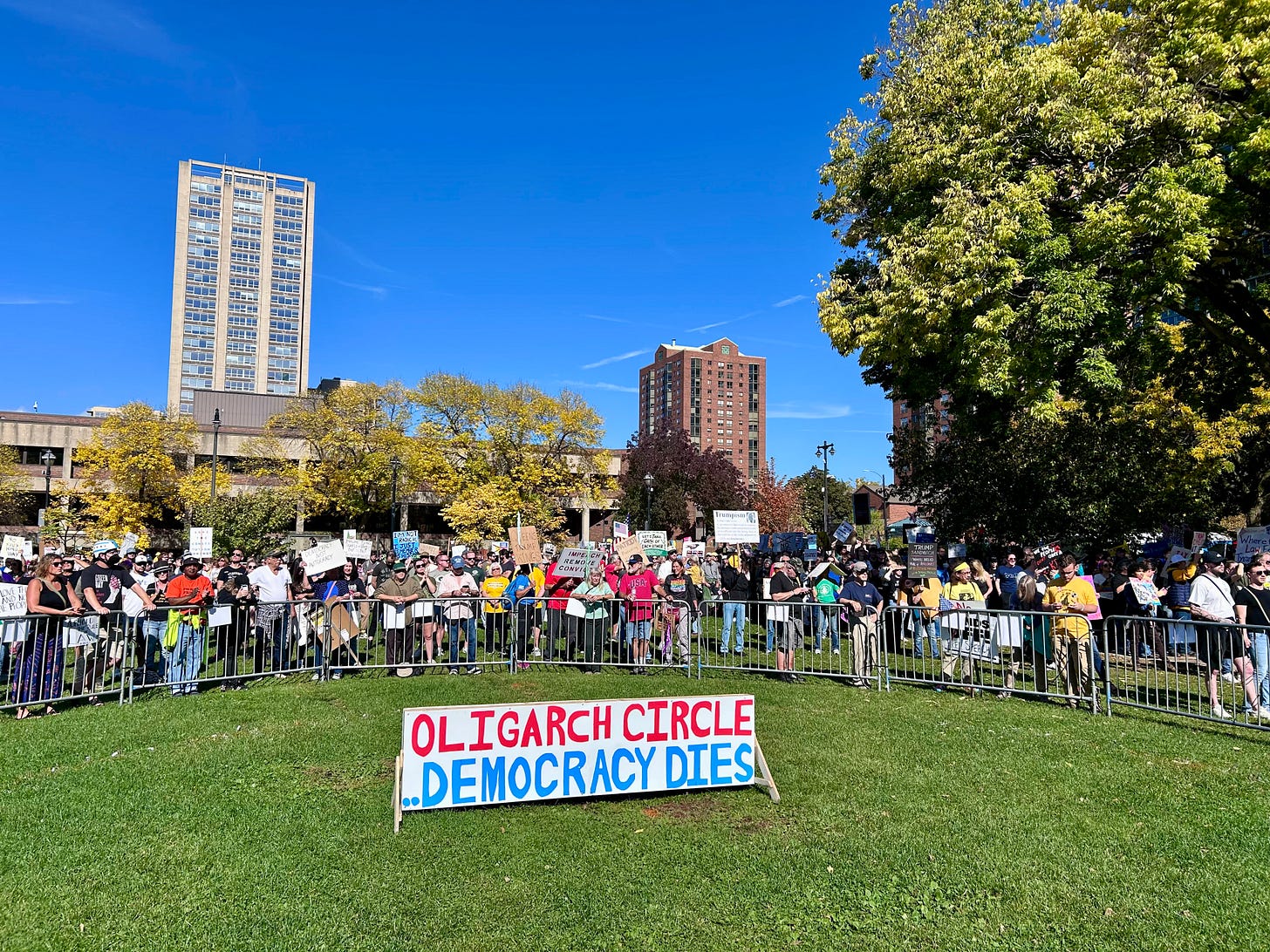 Thousands gathered peacefully at Cathedral Square Park, where a series of speakers (including Recombobulation Area contributor Angela Lang!) spoke at the park. Earl Ingram, host of the “What’s Going On with Earl Ingram” podcast on Civic Media, emceed and spoke at the event. Maggie Daun, host of “The Maggie Daun Show” on Civic Media, also spoke at the protest. You can watch the livestream from that here on the No Kings Milwaukee YouTube Channel.