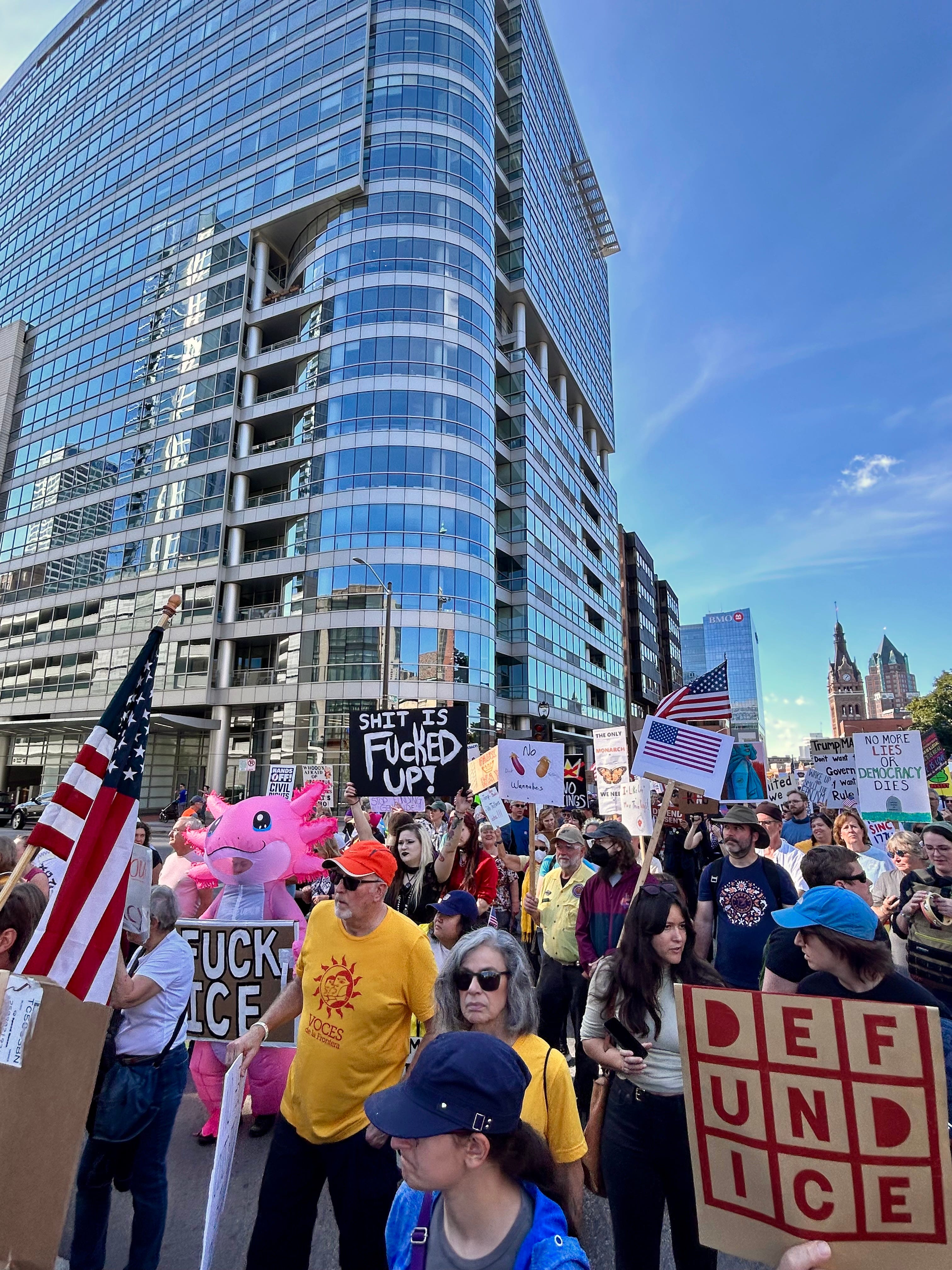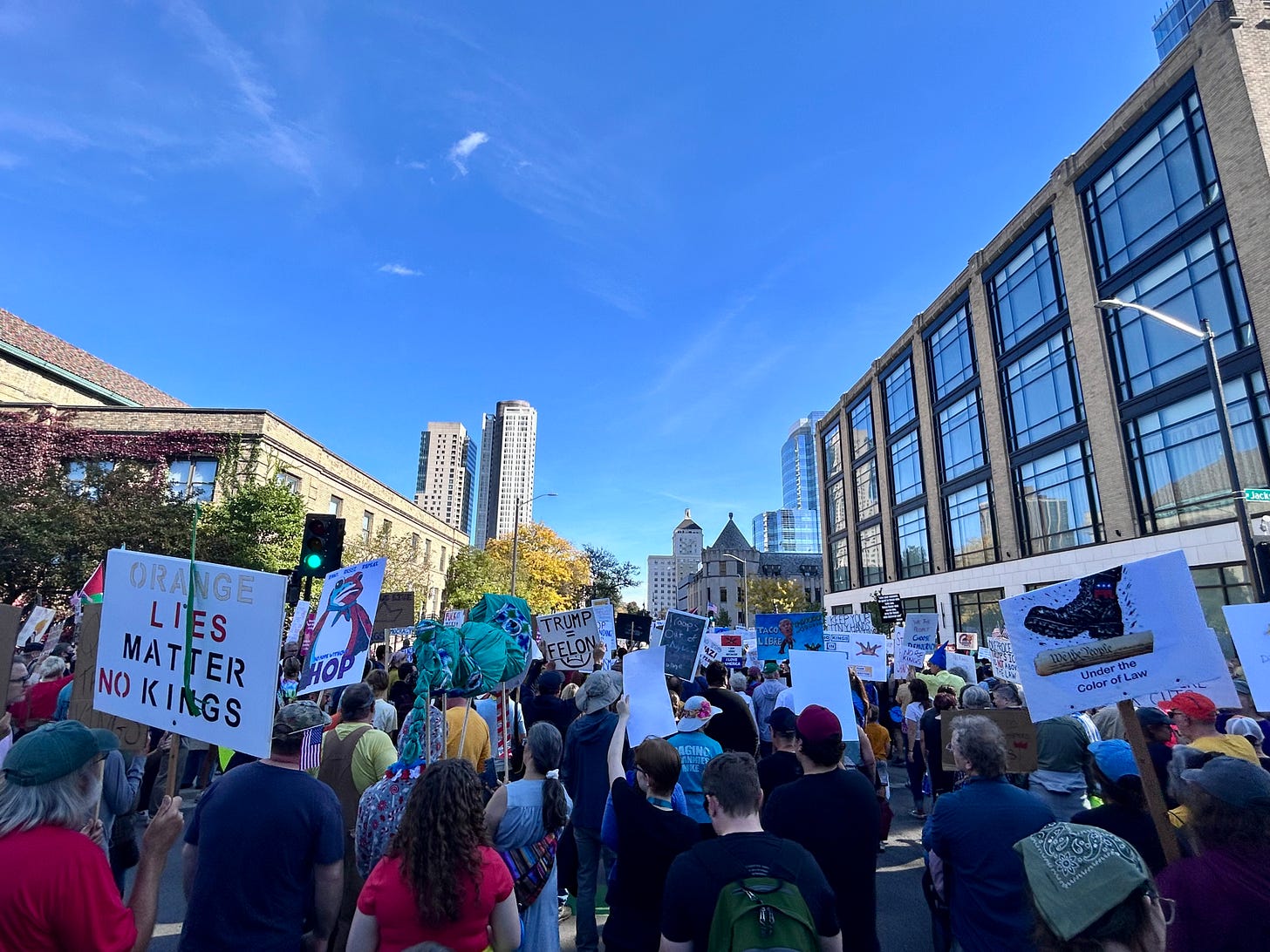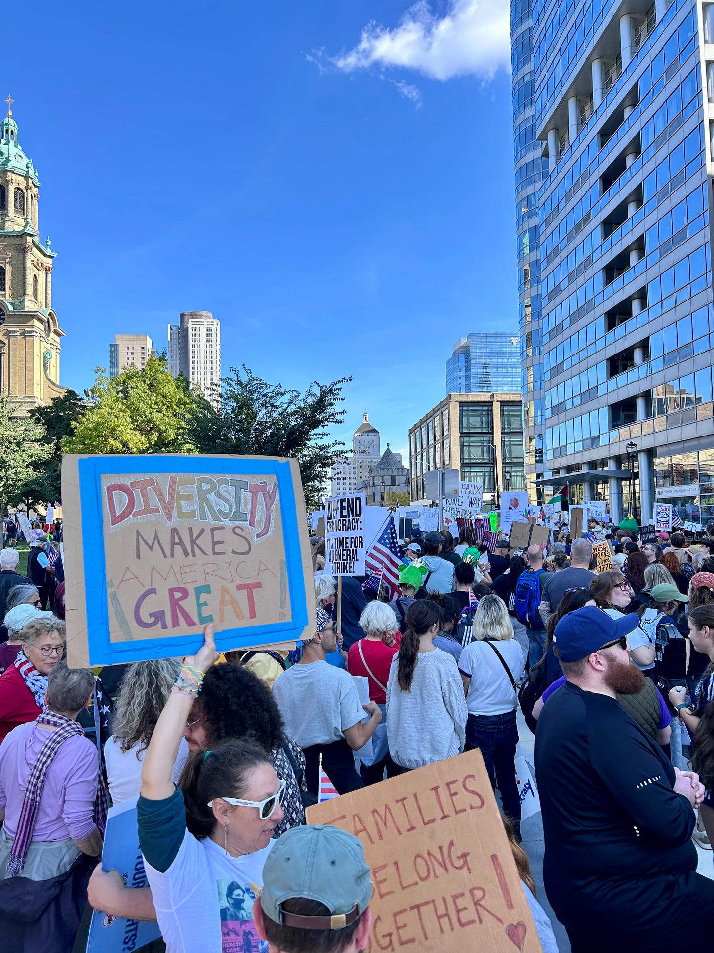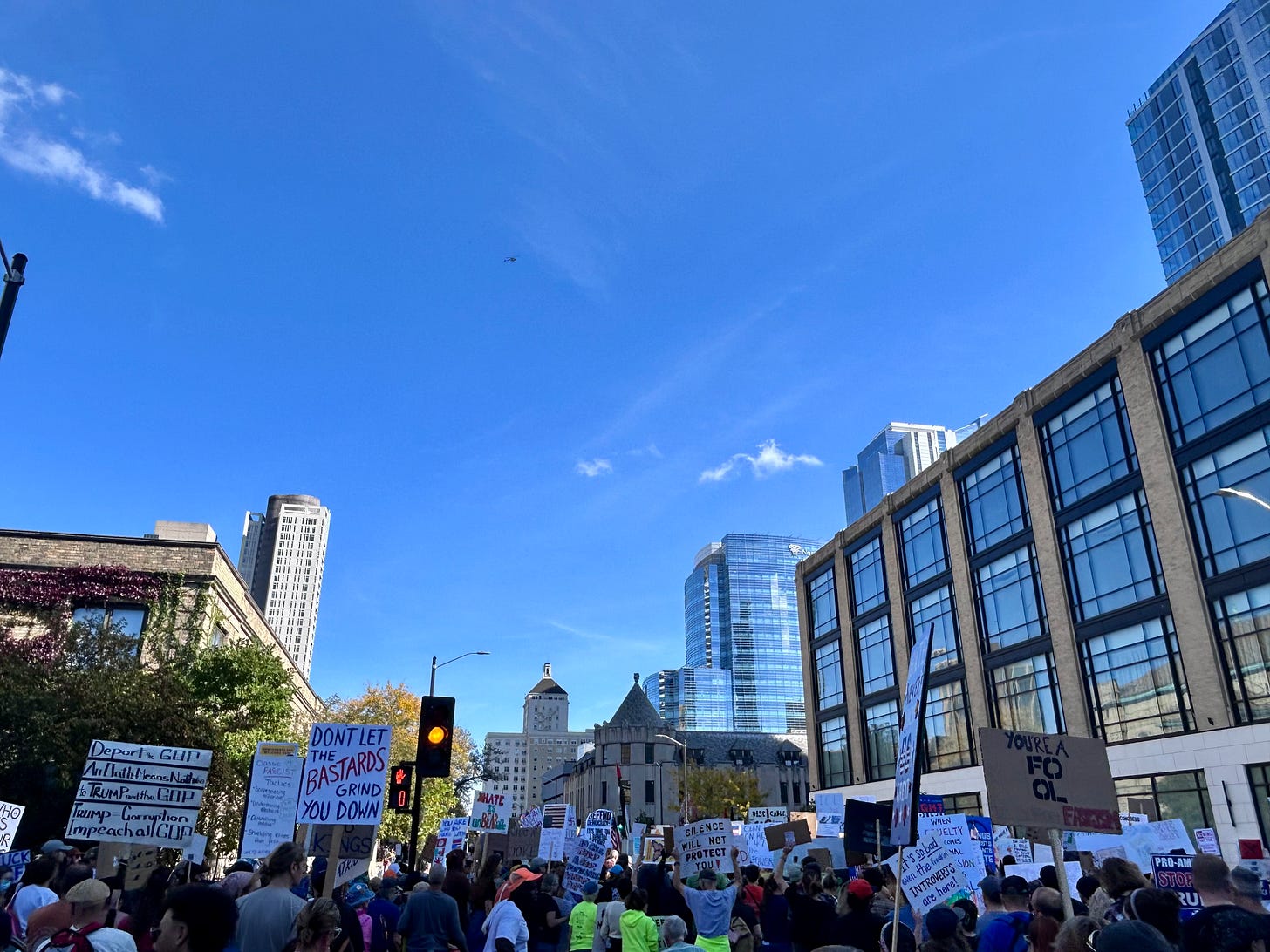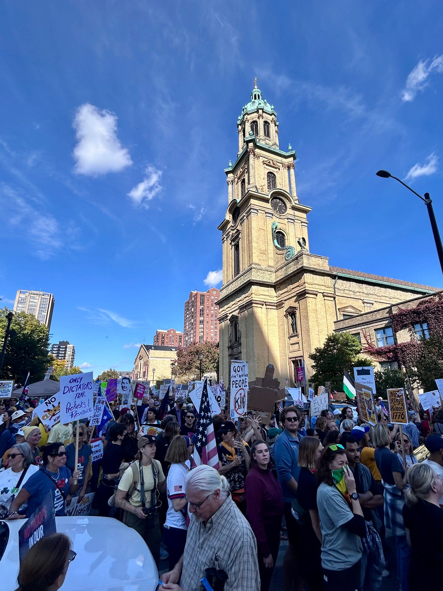 Thousands gathered peacefully at Cathedral Square Park, where a series of speakers (including Recombobulation Area contributor Angela Lang!) spoke at the park. Earl Ingram, host of the “What’s Going On with Earl Ingram” podcast on Civic Media, emceed and spoke at the event. Maggie Daun, host of “The Maggie Daun Show” on Civic Media, also spoke at the protest. You can watch the livestream from that here on the No Kings Milwaukee YouTube Channel.