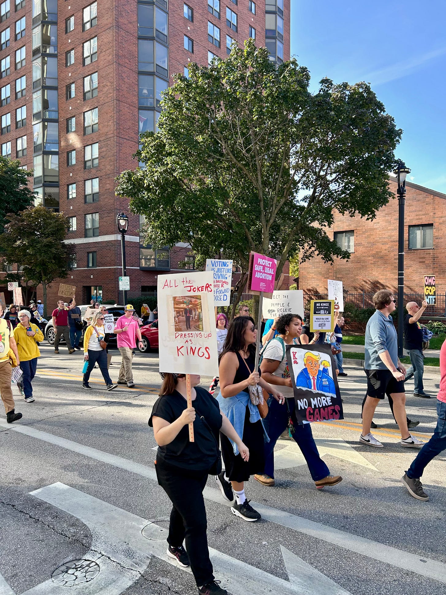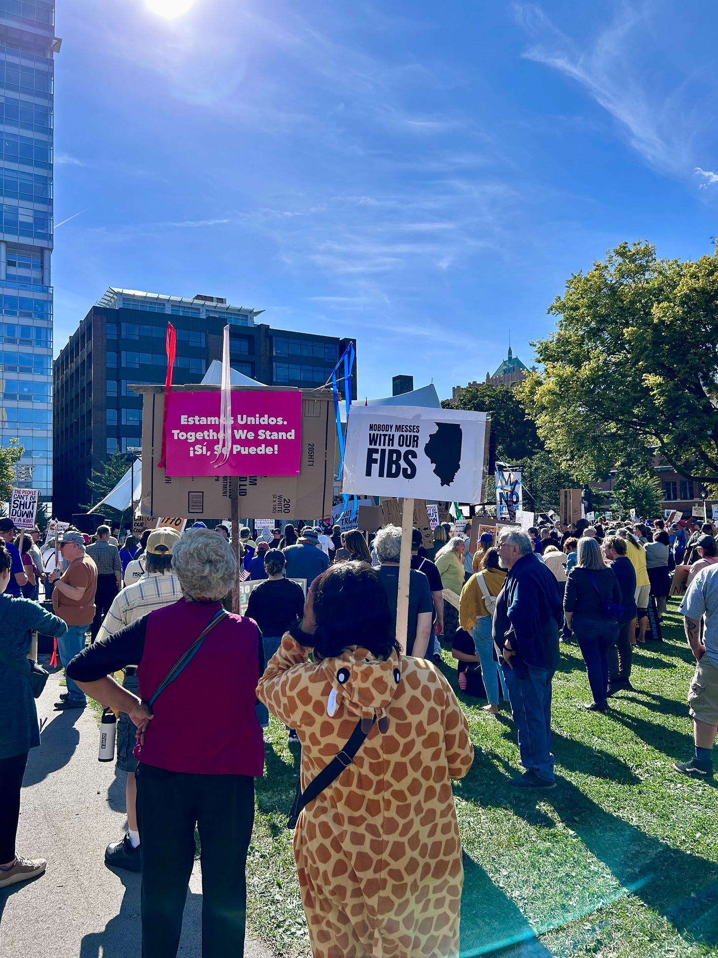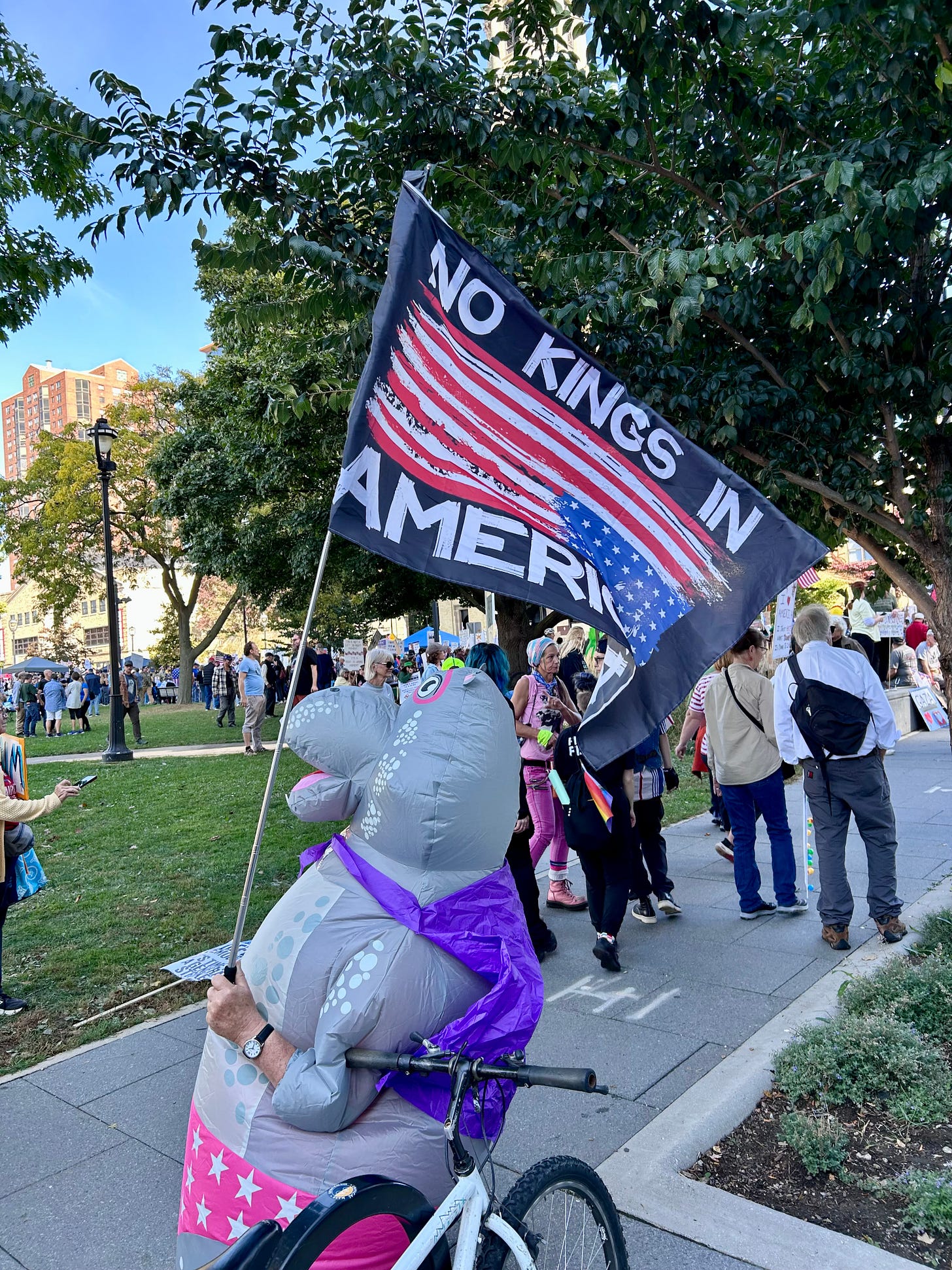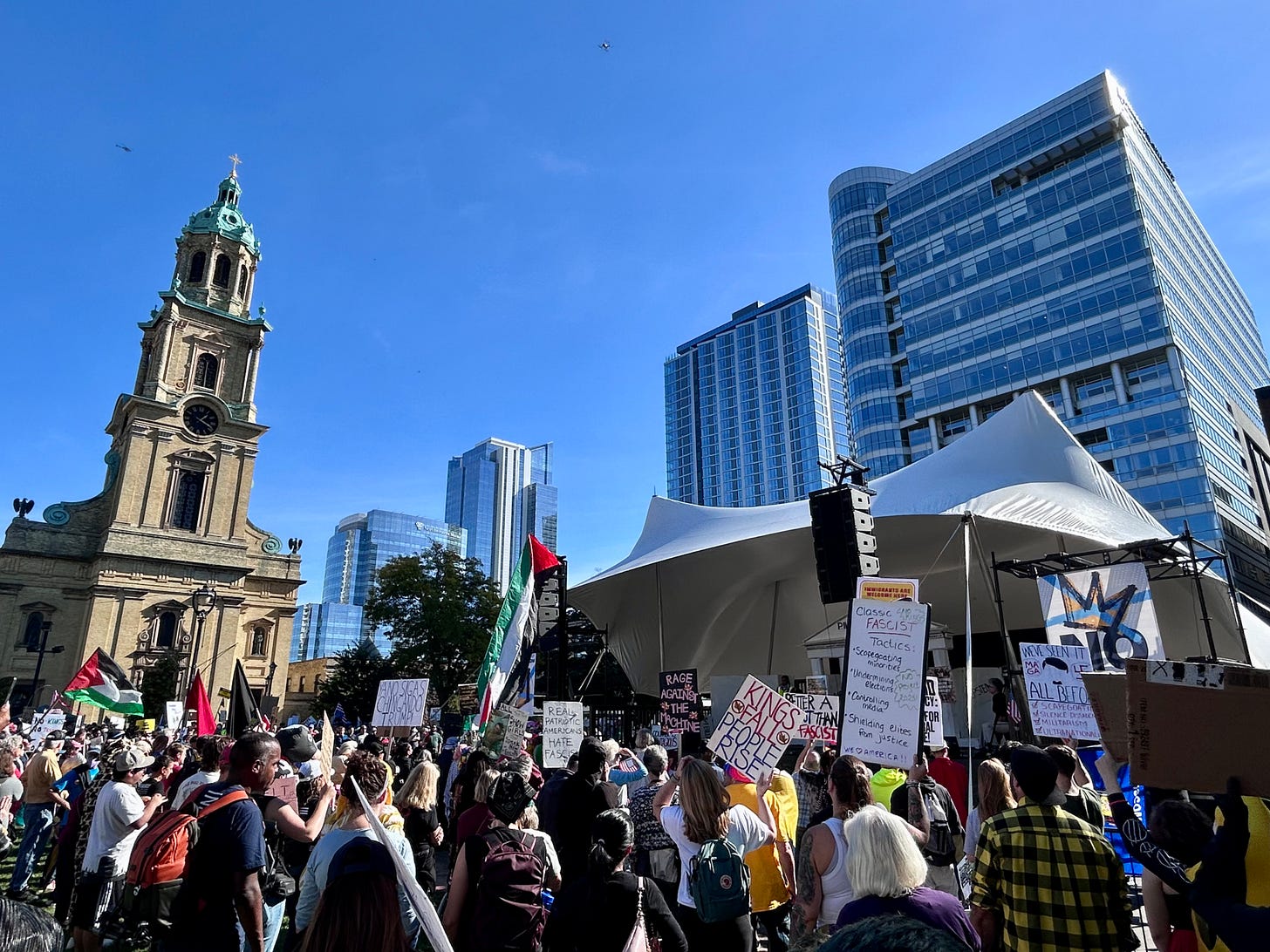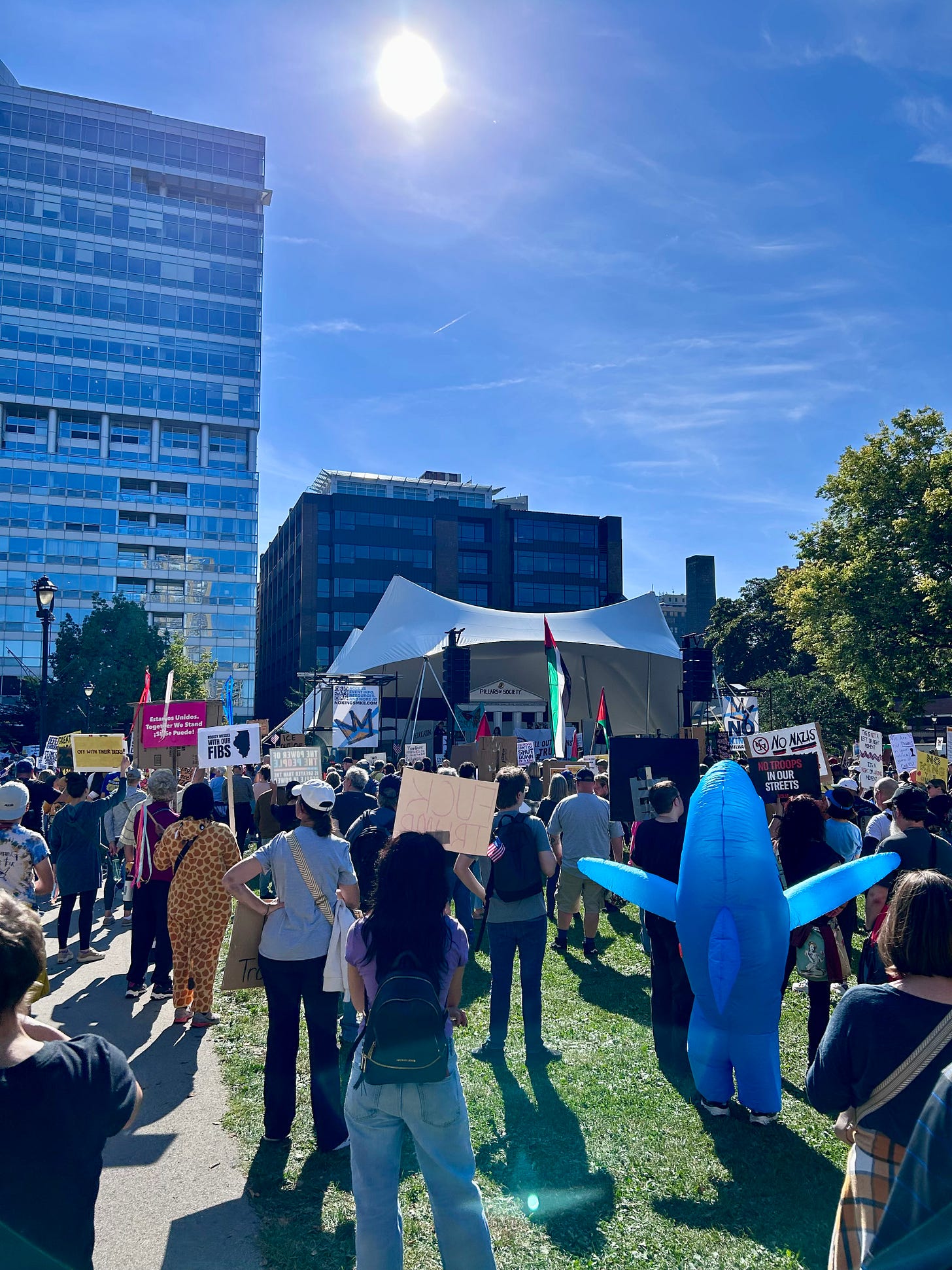 Thousands gathered peacefully at Cathedral Square Park, where a series of speakers (including Recombobulation Area contributor Angela Lang!) spoke at the park. Earl Ingram, host of the “What’s Going On with Earl Ingram” podcast on Civic Media, emceed and spoke at the event. Maggie Daun, host of “The Maggie Daun Show” on Civic Media, also spoke at the protest. You can watch the livestream from that here on the No Kings Milwaukee YouTube Channel.