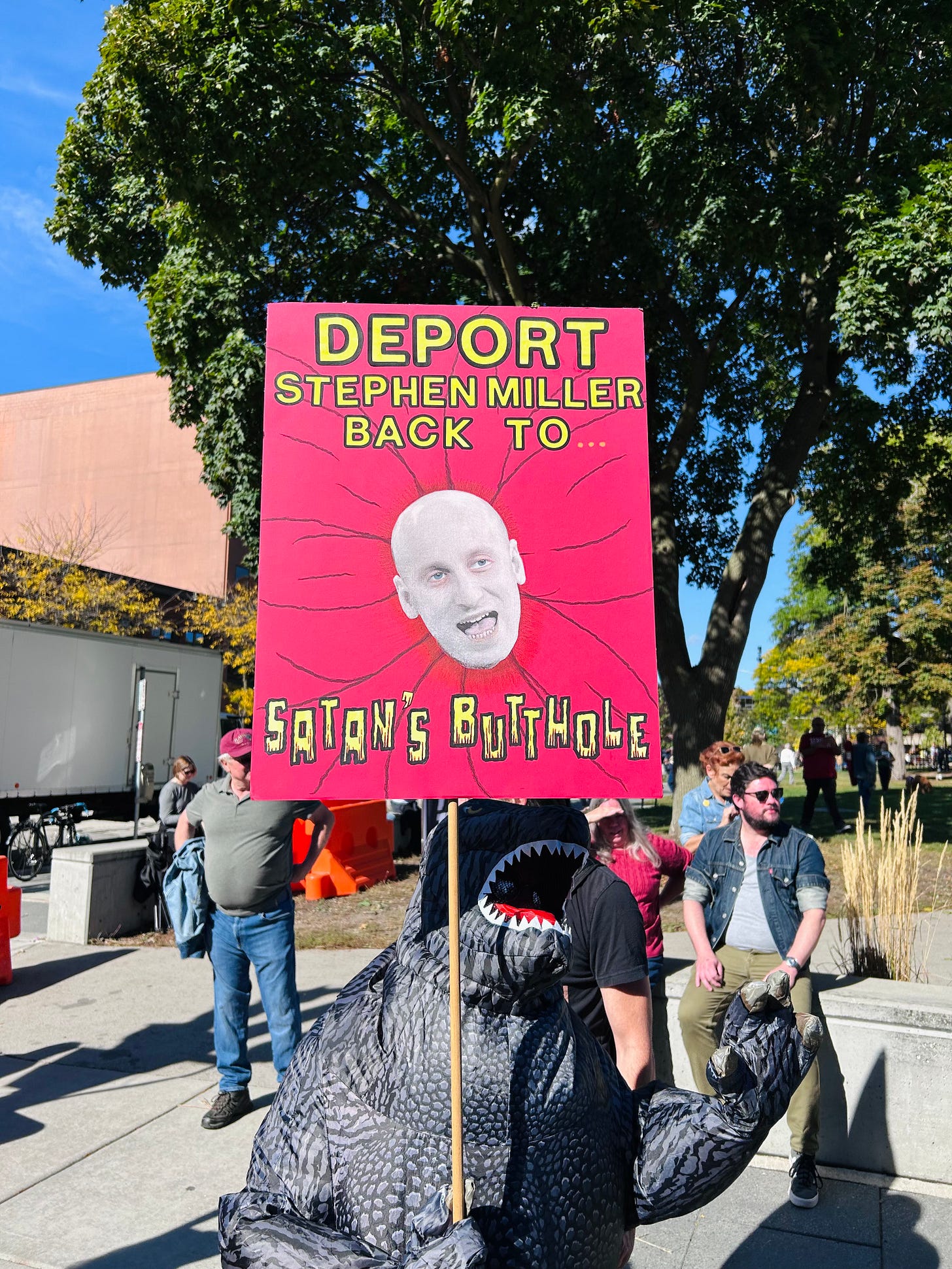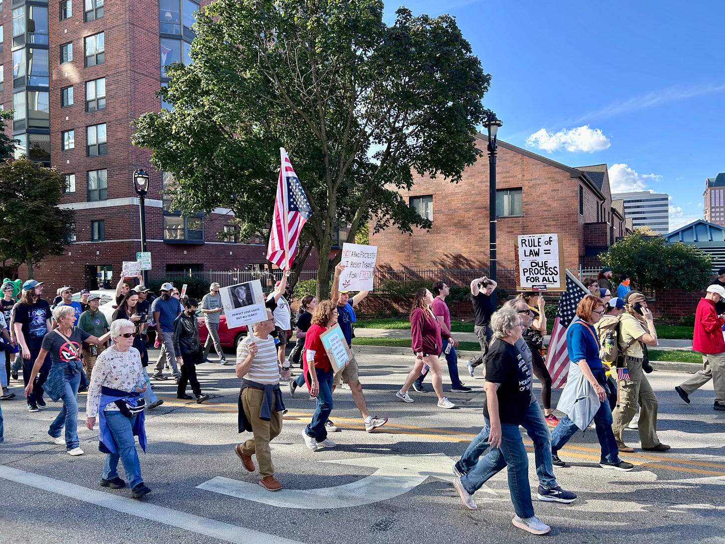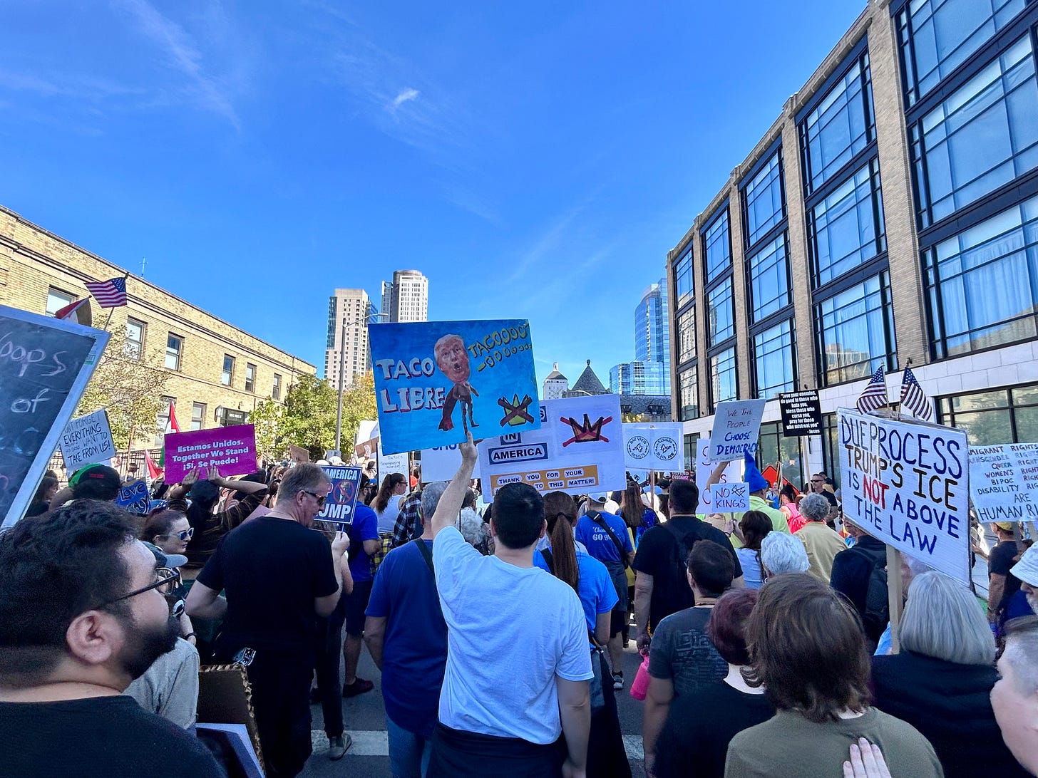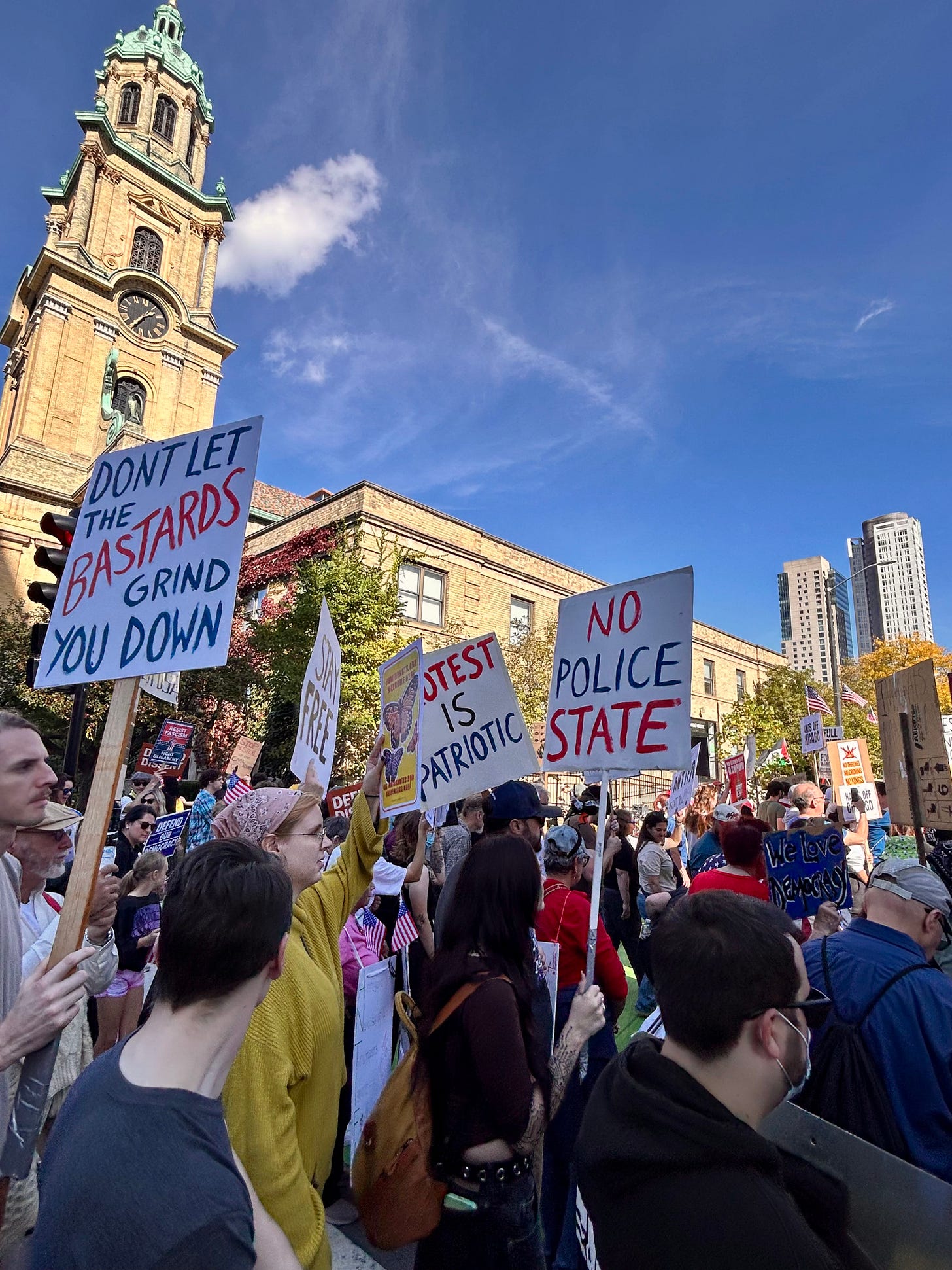Thousands gathered peacefully at Cathedral Square Park, where a series of speakers (including Recombobulation Area contributor Angela Lang!) spoke at the park. Earl Ingram, host of the “What’s Going On with Earl Ingram” podcast on Civic Media, emceed and spoke at the event. Maggie Daun, host of “The Maggie Daun Show” on Civic Media, also spoke at the protest. You can watch the livestream from that here on the No Kings Milwaukee YouTube Channel.