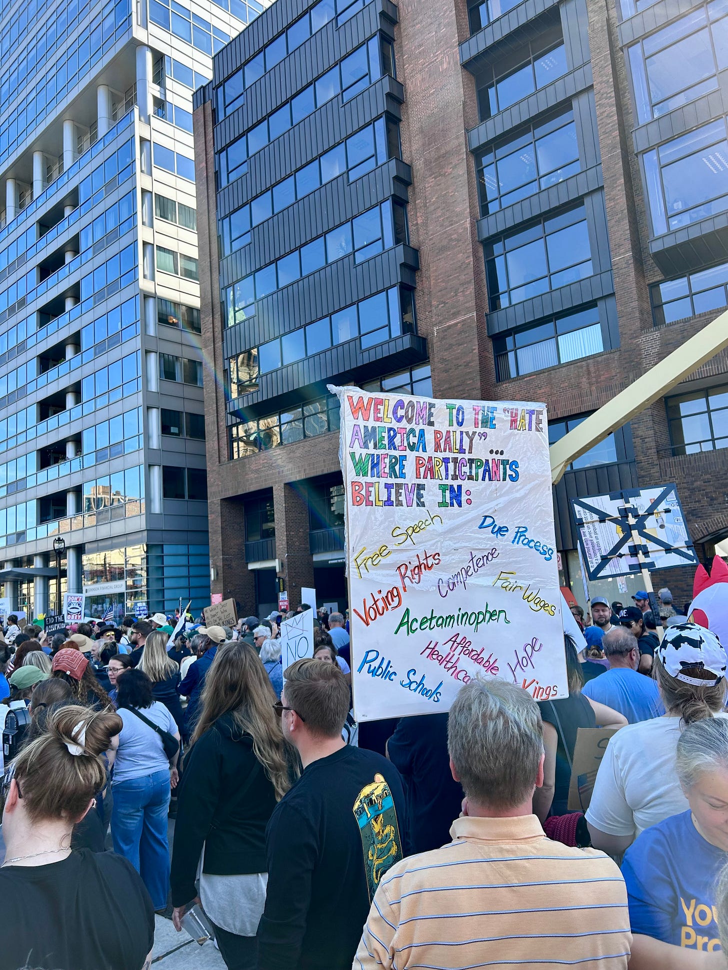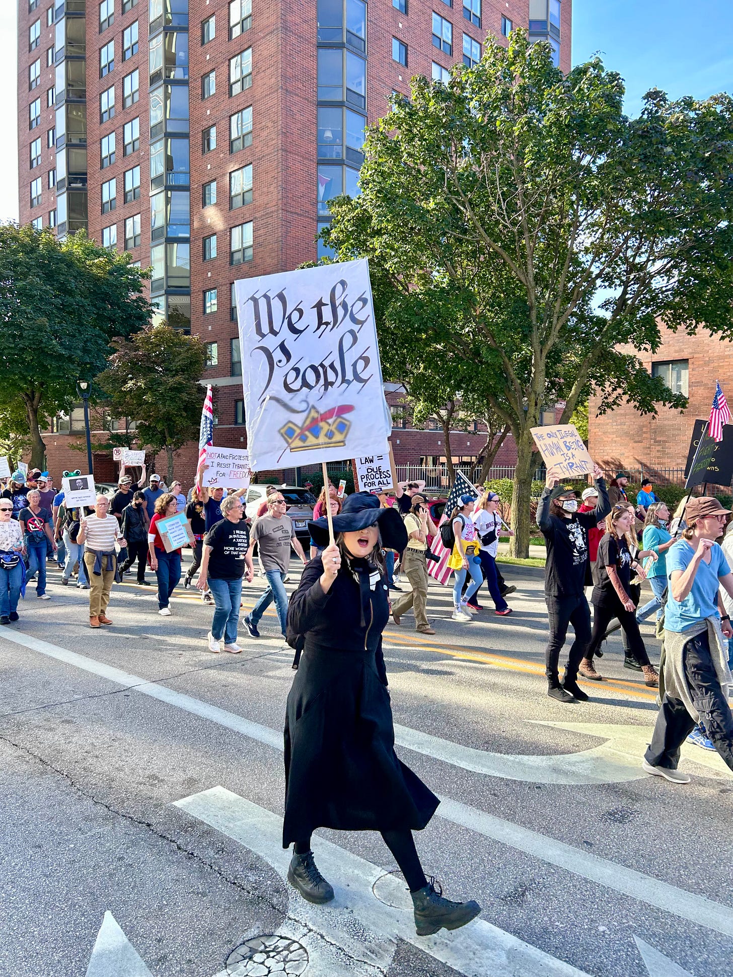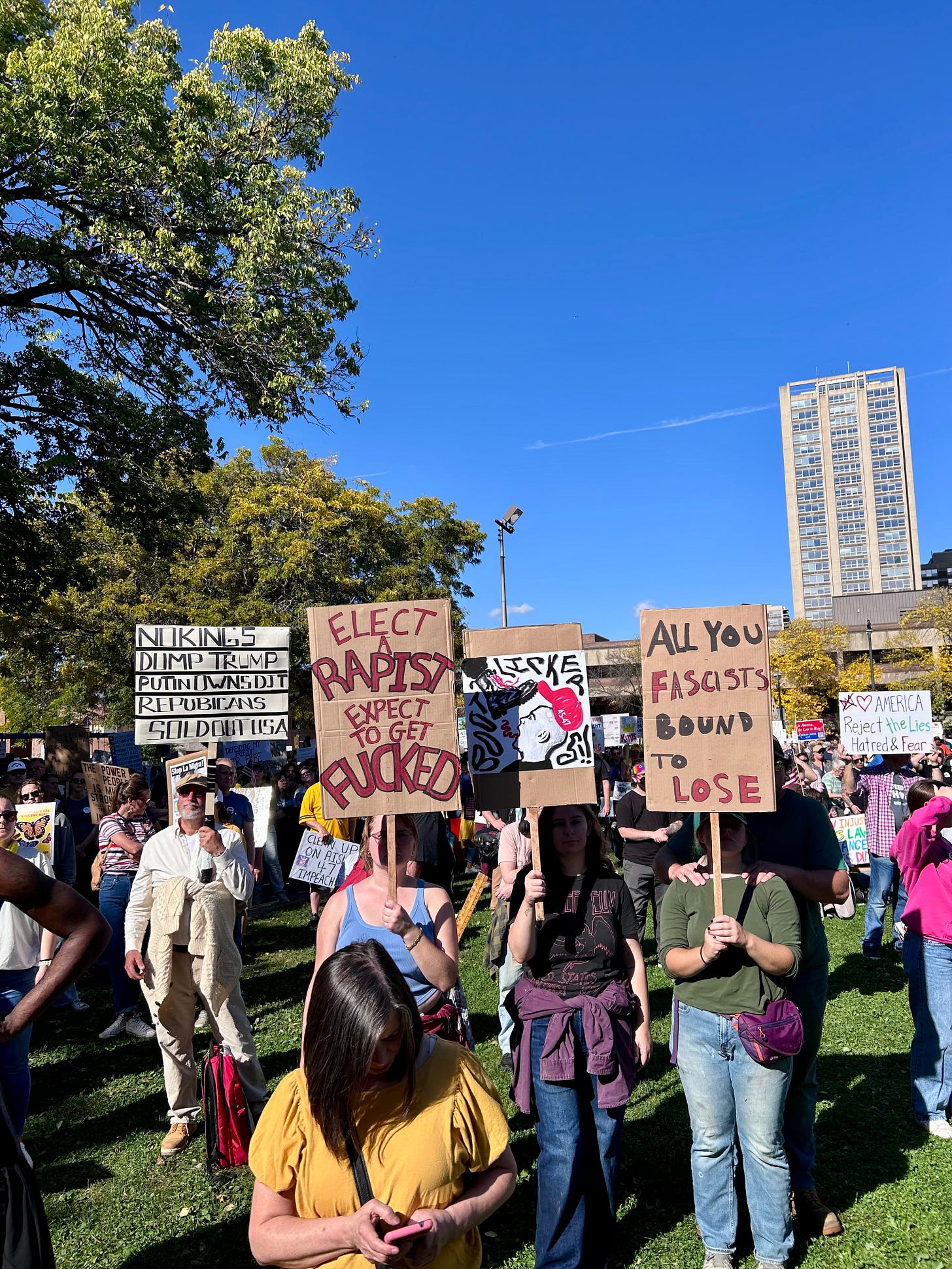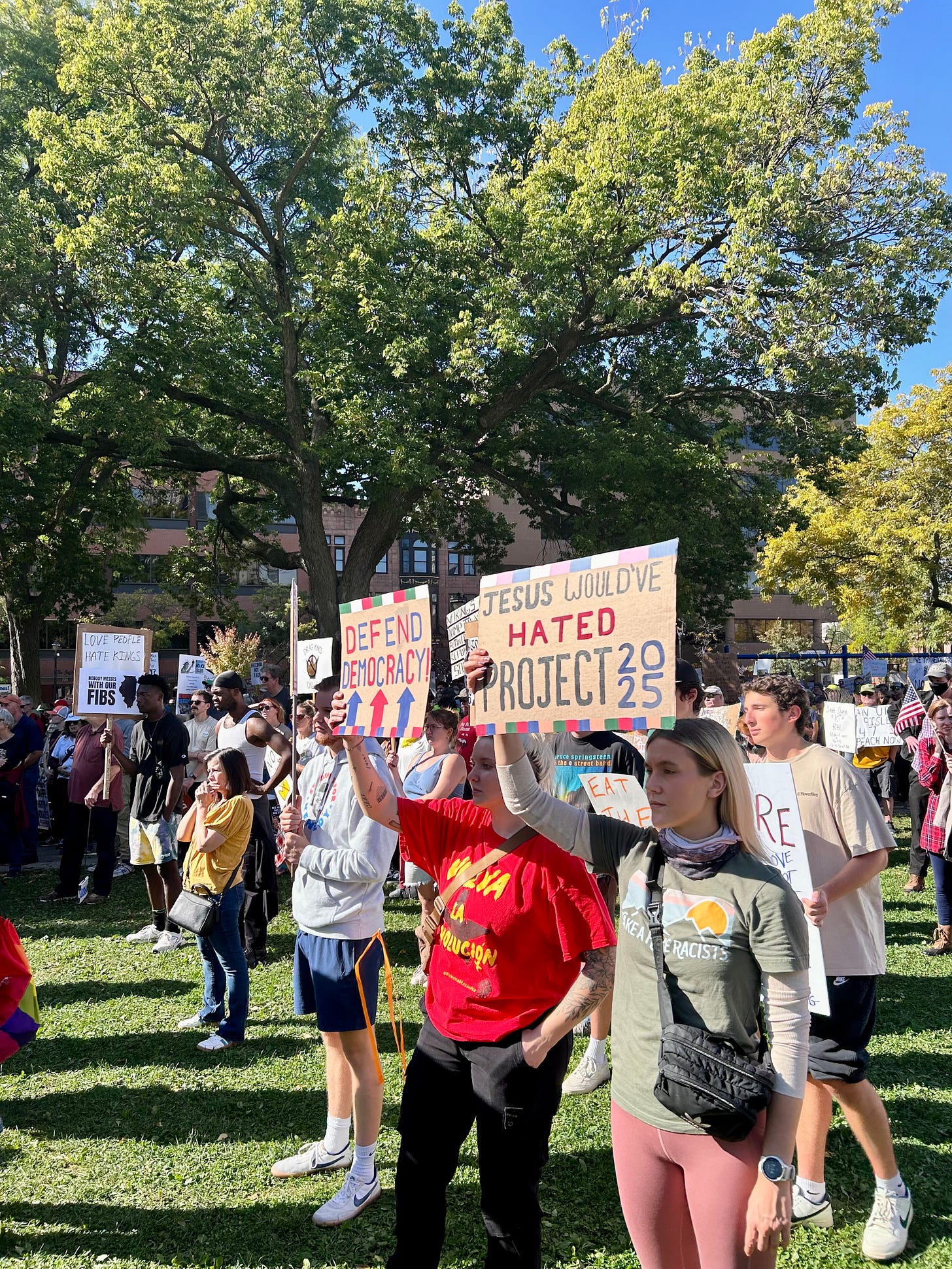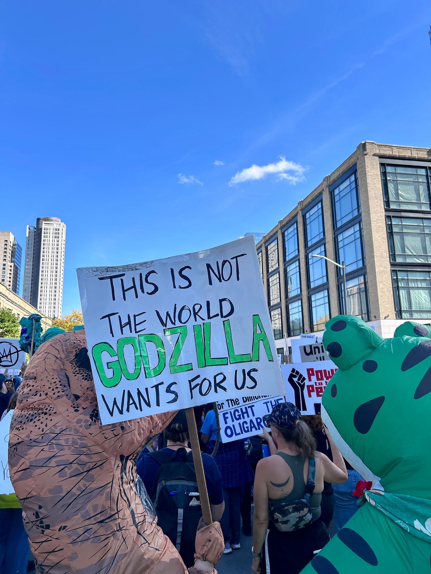 Thousands gathered peacefully at Cathedral Square Park, where a series of speakers (including Recombobulation Area contributor Angela Lang!) spoke at the park. Earl Ingram, host of the “What’s Going On with Earl Ingram” podcast on Civic Media, emceed and spoke at the event. Maggie Daun, host of “The Maggie Daun Show” on Civic Media, also spoke at the protest. You can watch the livestream from that here on the No Kings Milwaukee YouTube Channel.