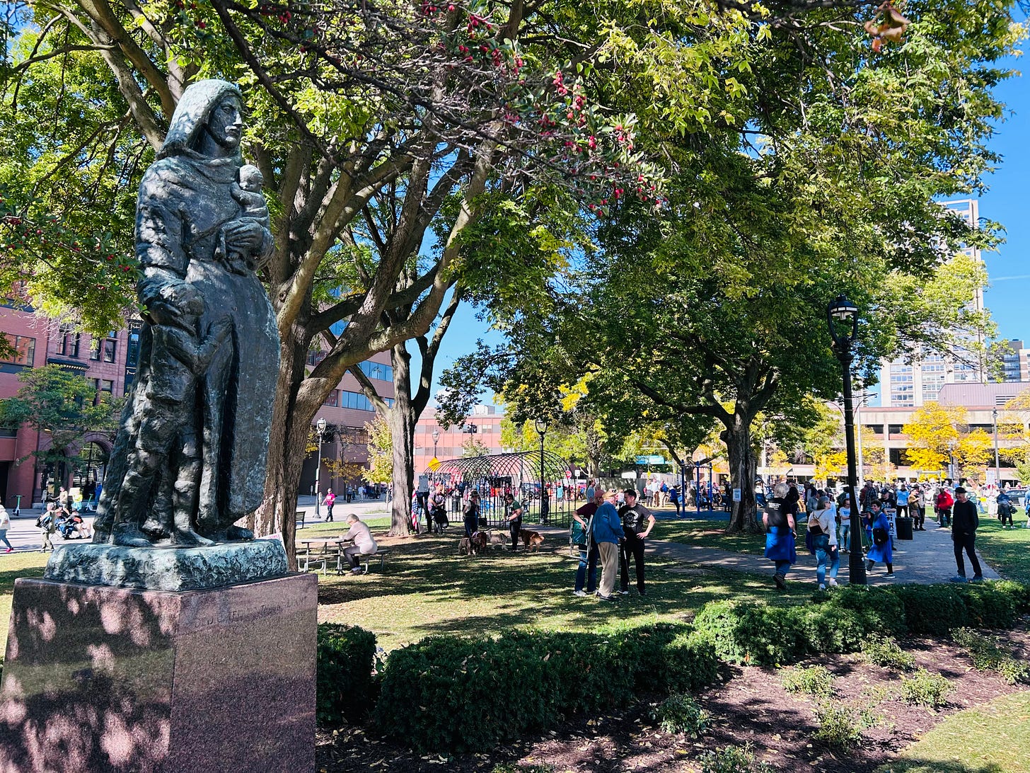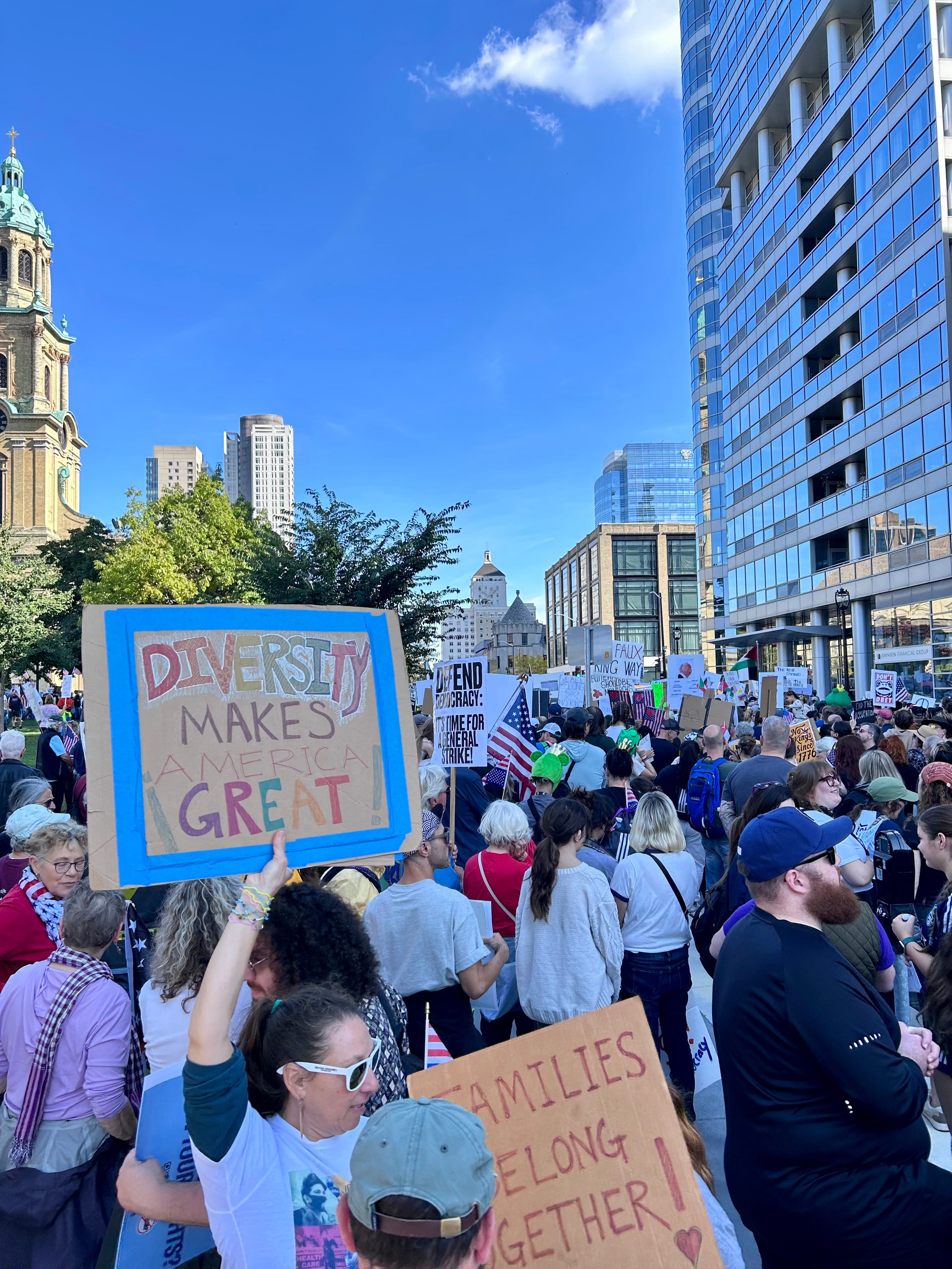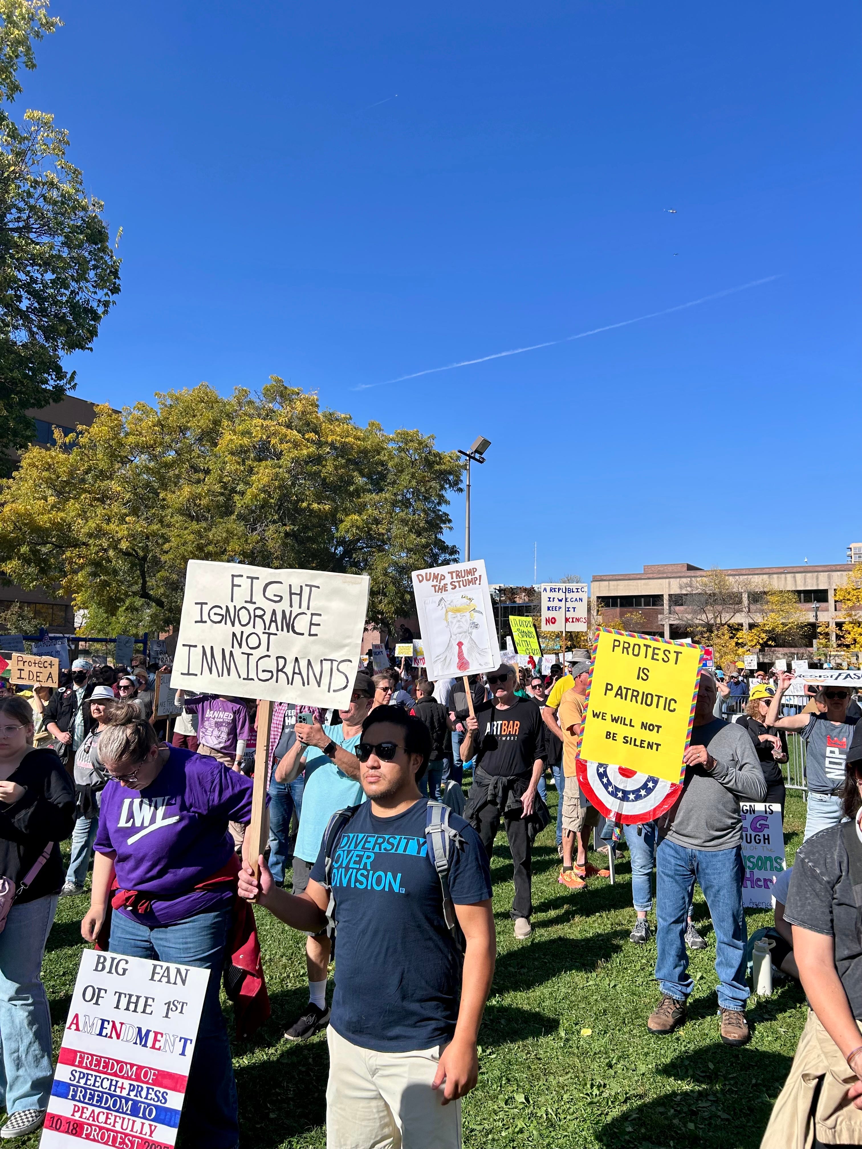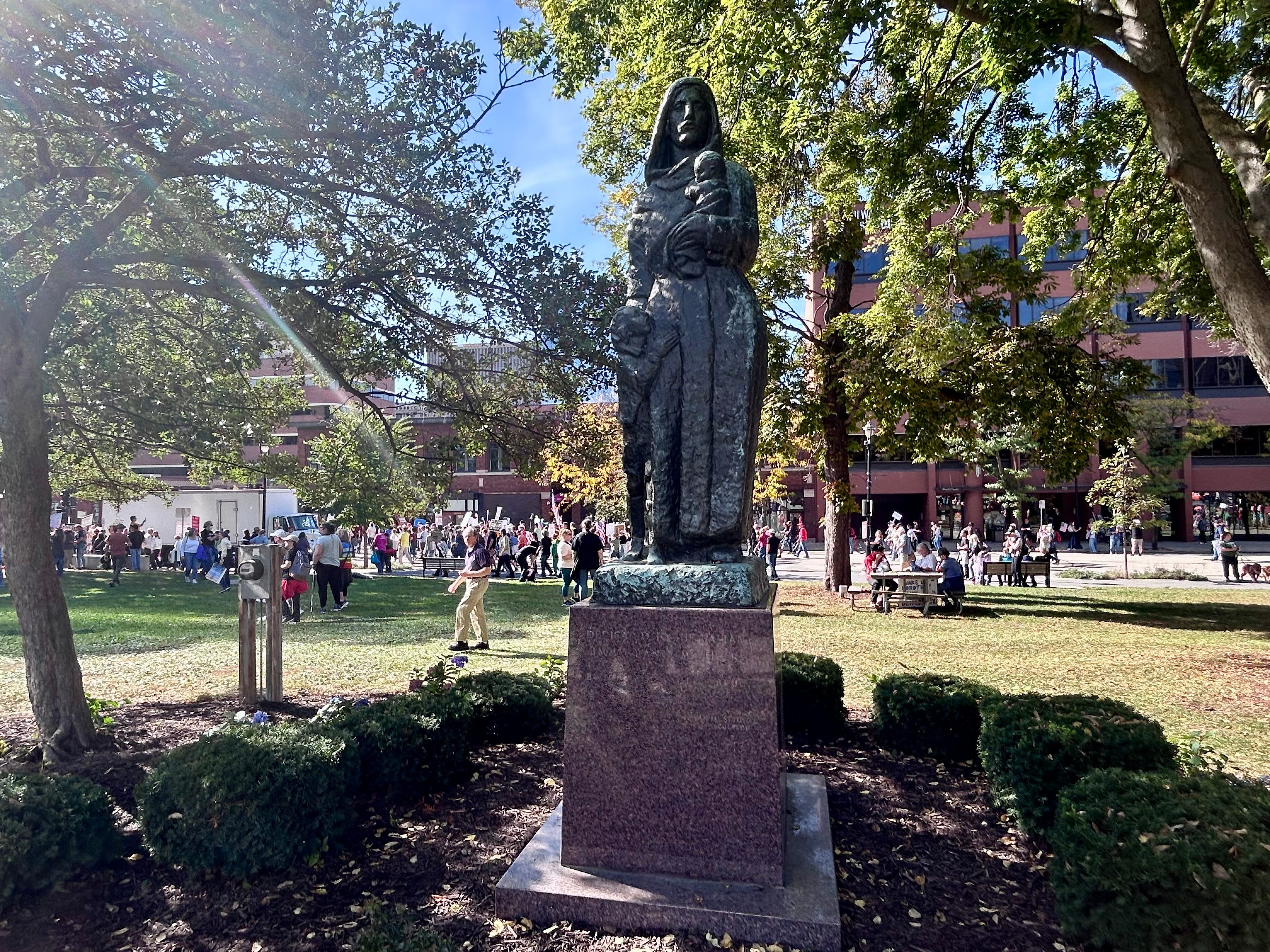 There’s a statue of a woman in Cathedral Square Park with an inscription that reads “DEDICATED TO THE VALIANT IMMIGRANT MOTHERS.” Perhaps it’s fitting then that this is the location where the Oct. 18 “No Kings” protest was held in the city of Milwaukee.