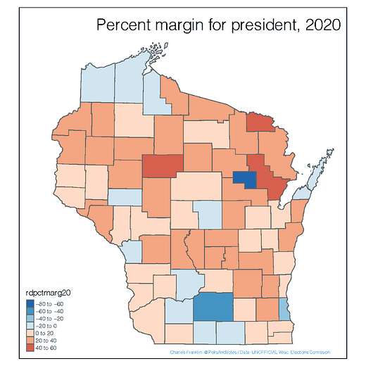 Joe Biden’s margin of victory in Dane was more than 181,000 votes — about even to the roughly 182,000-vote margin in much more populous Milwaukee County, and up by about 35,000 votes from Clinton’s margin in 2016. The Biden-Harris ticket was able to fuel this Democratic powerhouse, winning more than 75% of votes in the county.