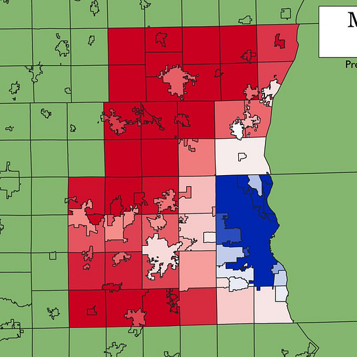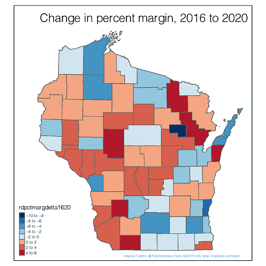 In the Fox Valley and northeastern Wisconsin, a region we focused on quite a bit here at The Recombobulation Area, Biden’s gains were modest at best, in the 2-4% range.