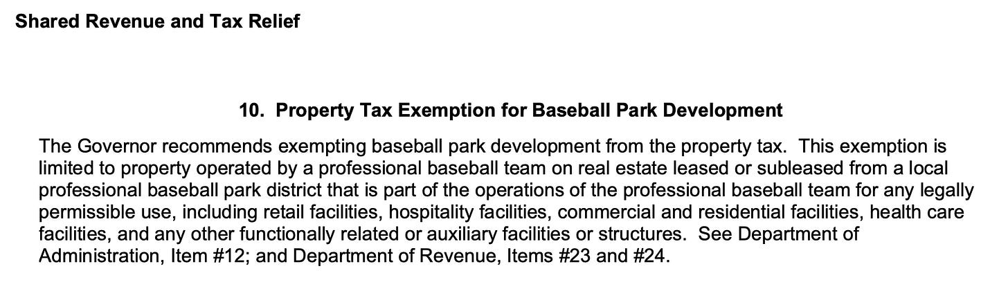 The governor’s budget proposal also includes a “property tax exemption for baseball park development.”