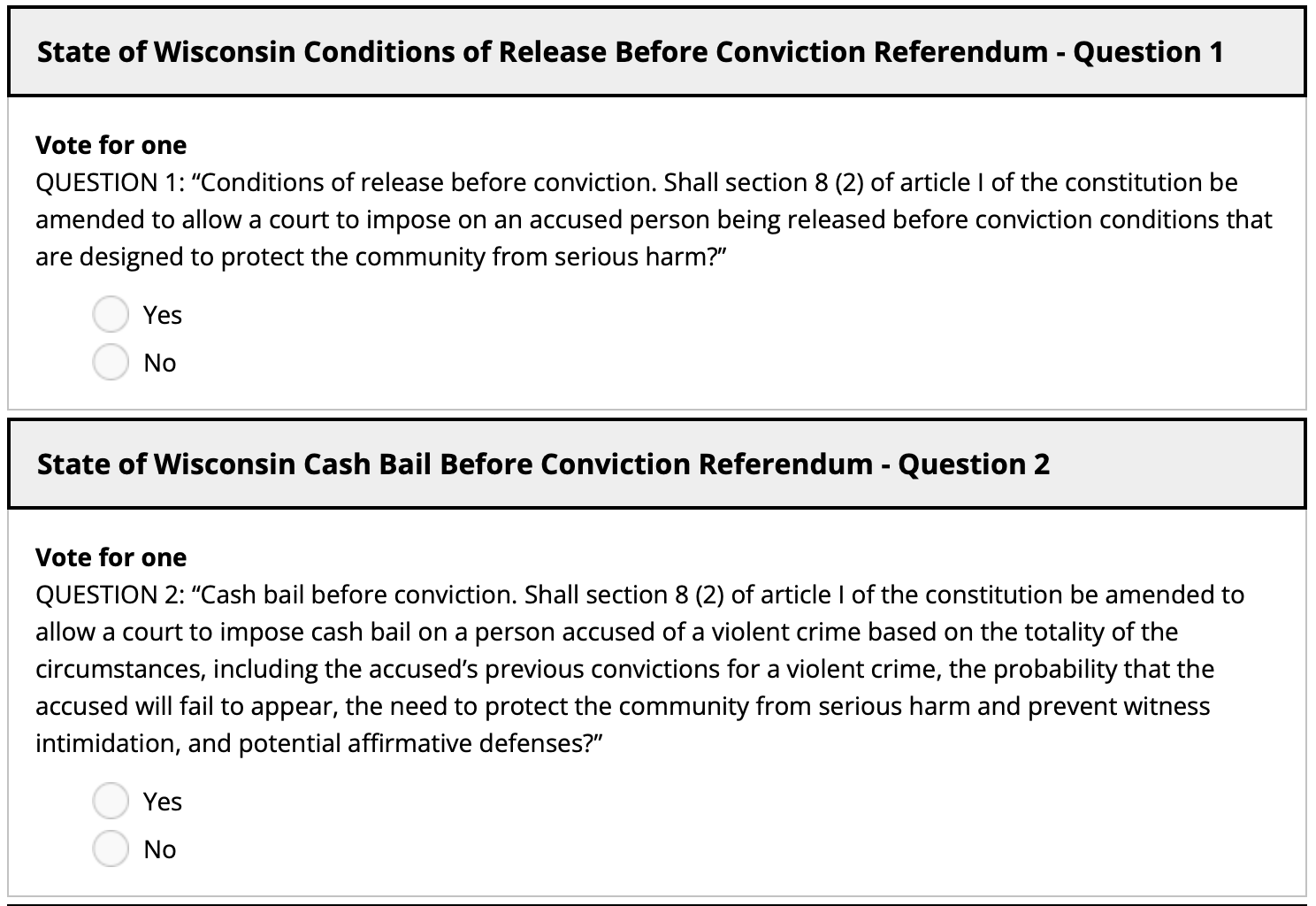 Vote “no” to referendum questions No. 1 and No. 2 to send the message that the wealthy of this country are not the only ones who should be able to await trial at home. Wisconsin, we have an opportunity to preserve jobs, education, and families by voting not to lock up thousands more people in already overcrowded jails to await trial, forcing innocent people to take plea deals to resume their lives. We have an obligation to say no to our impulse to be reactionary, to resort to the lowest common denominator, to seek endless punishment.